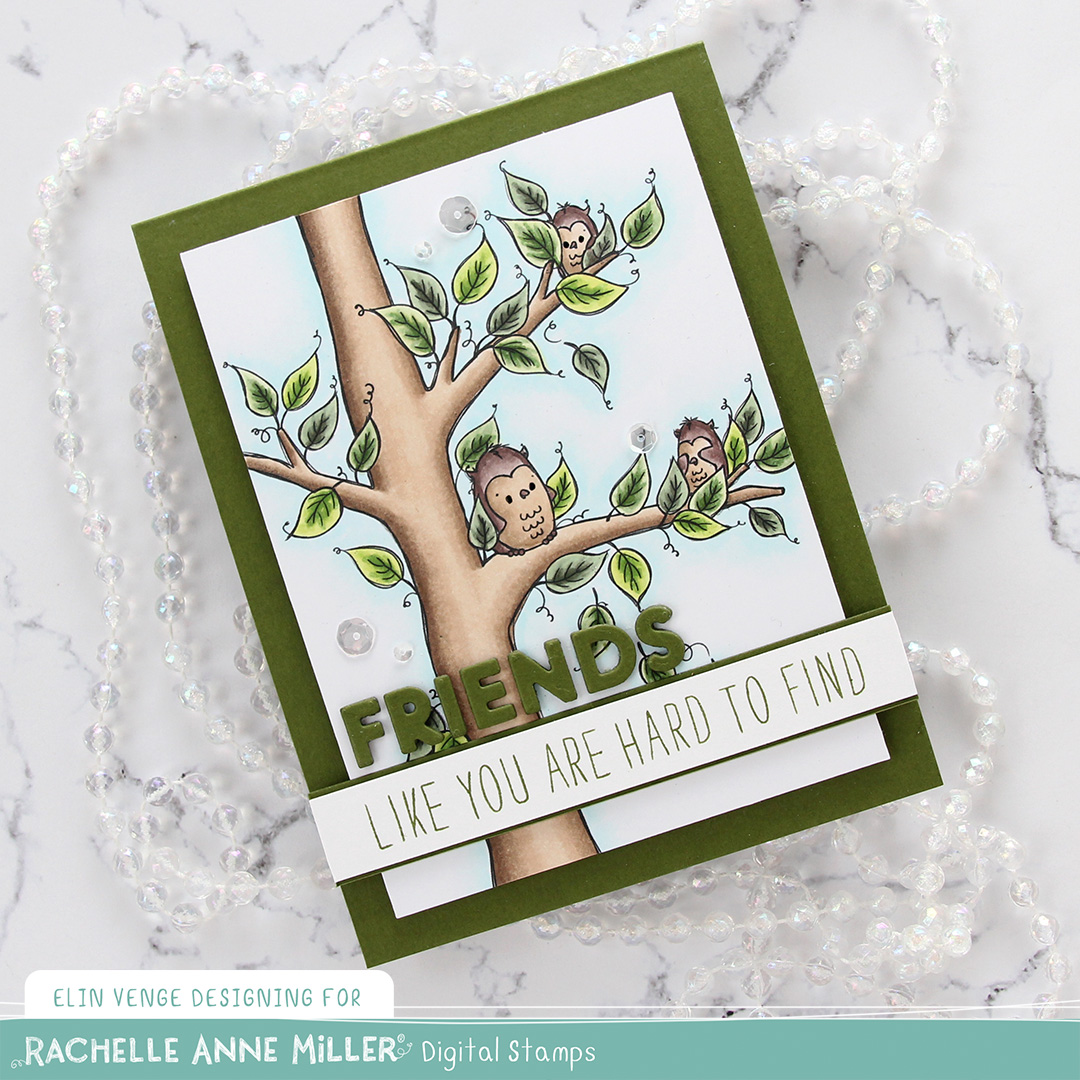 The sentiment comes with the image. You can omit it if you want to, but I really like both the placement and the mix of the handwritten style with the playful print style. I decided to also add a few additional leaves above their heads. Aside from the green leaf to the left of the bird and the one leaf that’s landed on the hat, all the leaves above their heads are ones I added. I did that by copying the leaves already in the image and placing them where I wanted them; it’s one of the many advantages of working with digital stamps.