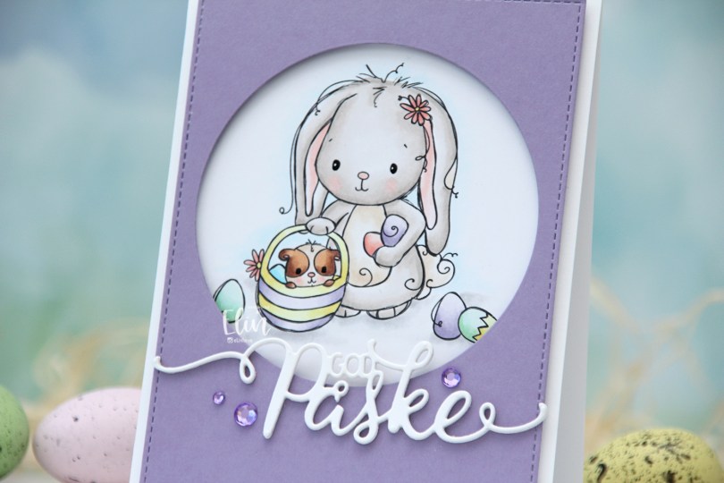 I added the panel to a card base made from Lavender Moon card stock from Papertrey Ink. I die cut God påske (die from Papirdesign) four times; three from white card stock and once from Lavender Moon. I stacked them and centered my dimensional die cut as best I could above the image, before finishing off with some sequins from the White Orchid Sequin Mix from Little Things from Lucy’s Cards. I love her mixes, they’re awesome!