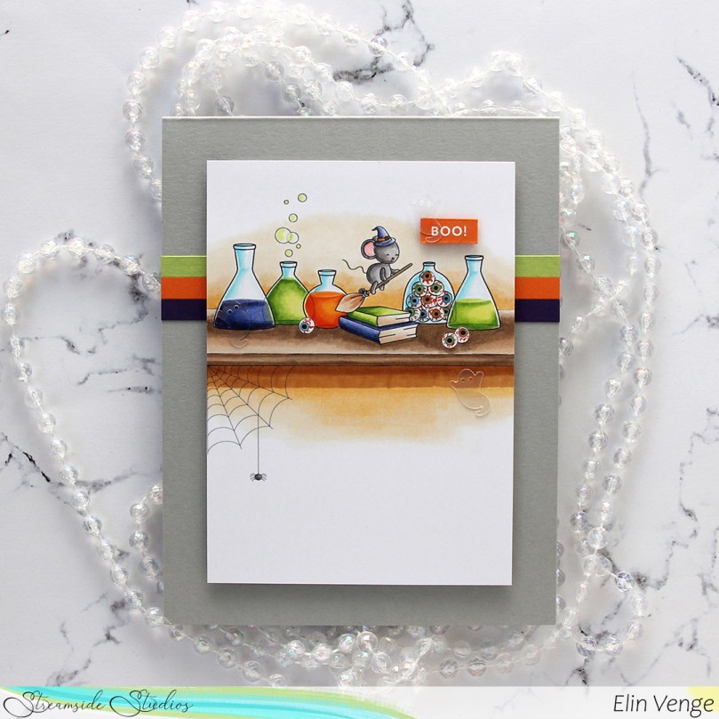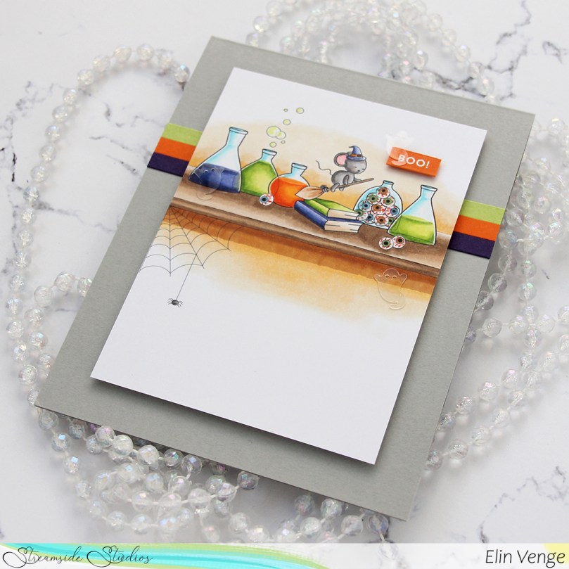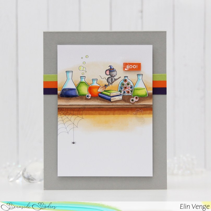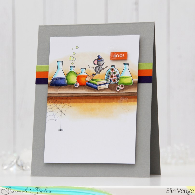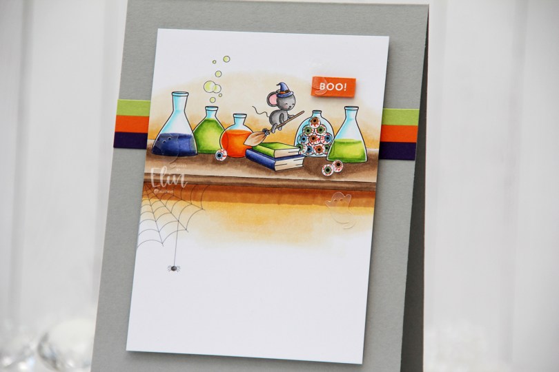I’m known on the design team for occasionally printing my images very small. This time I might have set a new record, the mouse and the eyeballs in this scene were so small, they were tricky to color, but I really wanted them this size to fit the scene and the card design.