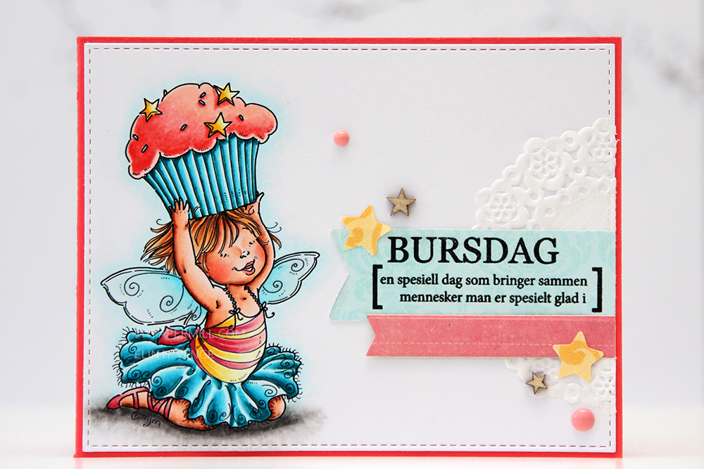 I diecut the banners, as well as the main panel, using dies from My Favorite Things. MFT dies are my favorite, they’re so versatile. I glued part of a doily underneath my banners and stamped a Norsk Stempelblad AS sentiment on the biggest one (It says “BIRTHDAY – a special day that brings together people you love” in Norwegian).