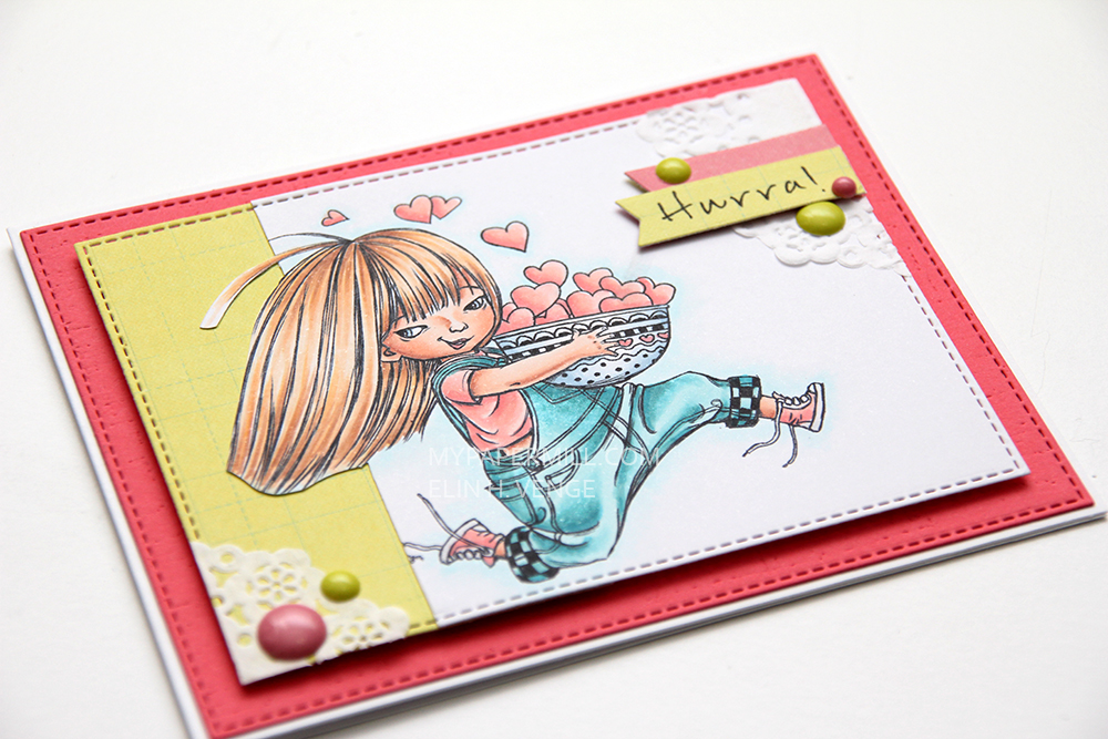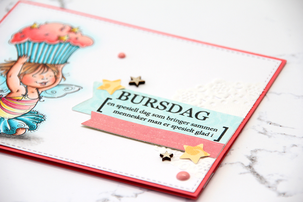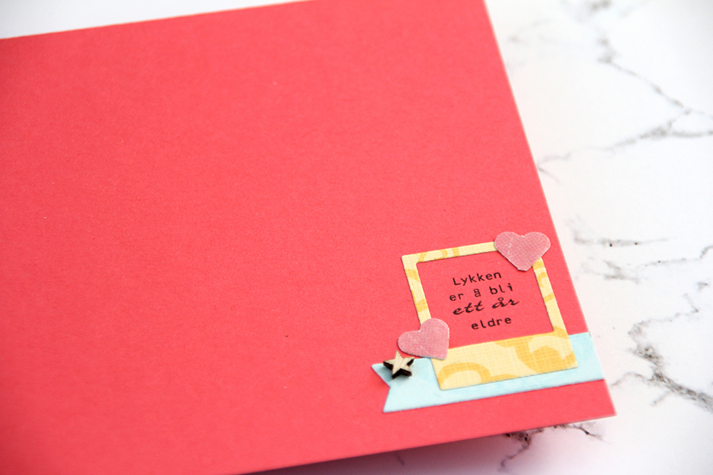 I put a tiny cluster on the inside. Another banner diecut using an MFT die, another veneer star and also a polaroid frame, diecut with another MFT die – told you they’re my favorite. A couple of punched little pink hearts and another Norsk Stempelblad AS sentiment (Happiness is being one year older), and my card was done.
