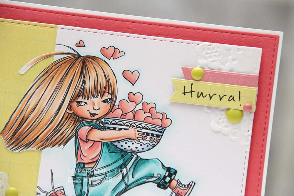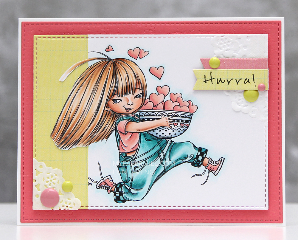 I used the same patterned paper for my sentiment strip, which I stamped with a Norsk Stempelblad AS stamp and then diecut using one of the Fishtail Flag Frames dies from My Favorite Things. The pink patterned paper behind the sentiment strip is actually the other side of that same patterned paper. I thought it fit my Papertrey Ink Berry Sorbet cardstock pretty well, in addition to the pink in the actual image. The pink cardstock is debossed with an impression plate from Papertrey Ink and then diecut with a stitched rectangle die from My Favorite Things. I also added some enamel dots in coordinating colors, as well as a couple of scraps of some doilies I had in my stash.