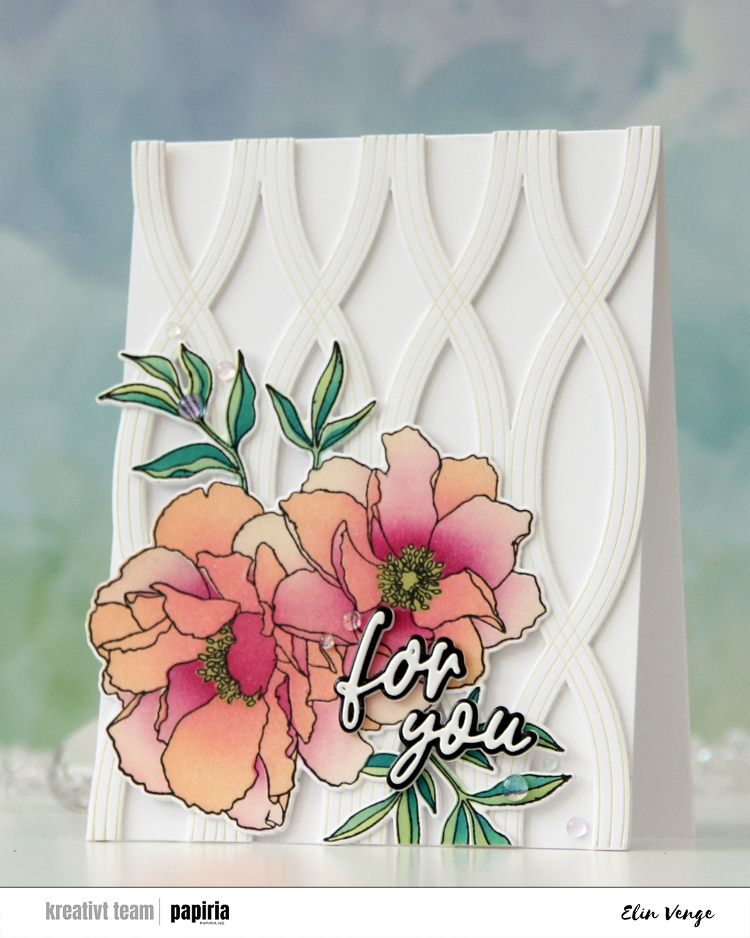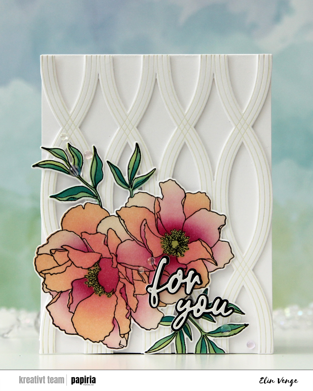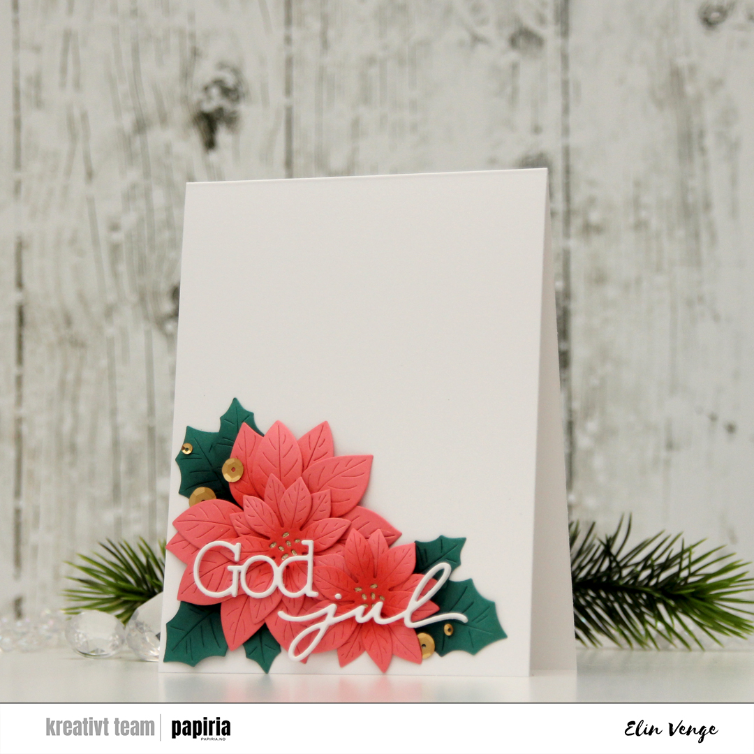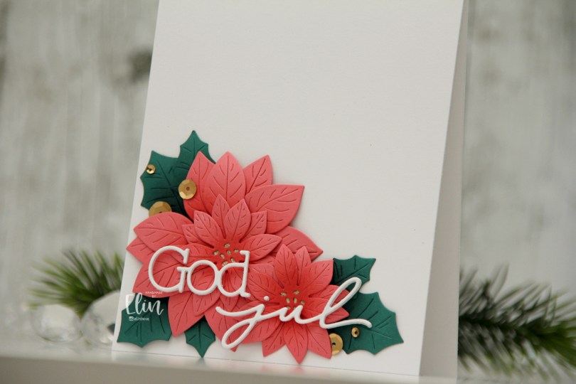 I actually shared this one on the Papiria blog back in December, but I thought I’d share here, as well. I die cut the parts for the florals from Watermelon cardstock and the leaves from Juniper cardstock, both are C9 colors. I ink blended the petals with Watermelon ink and the leaves with Rainforest ink, which is a darker green than the Juniper color. I curled all the petals and leaves back before assembly, and adhered them all to a white card base. I used gold glitter cardstock from Kort & Godt for the centers of the flowers.