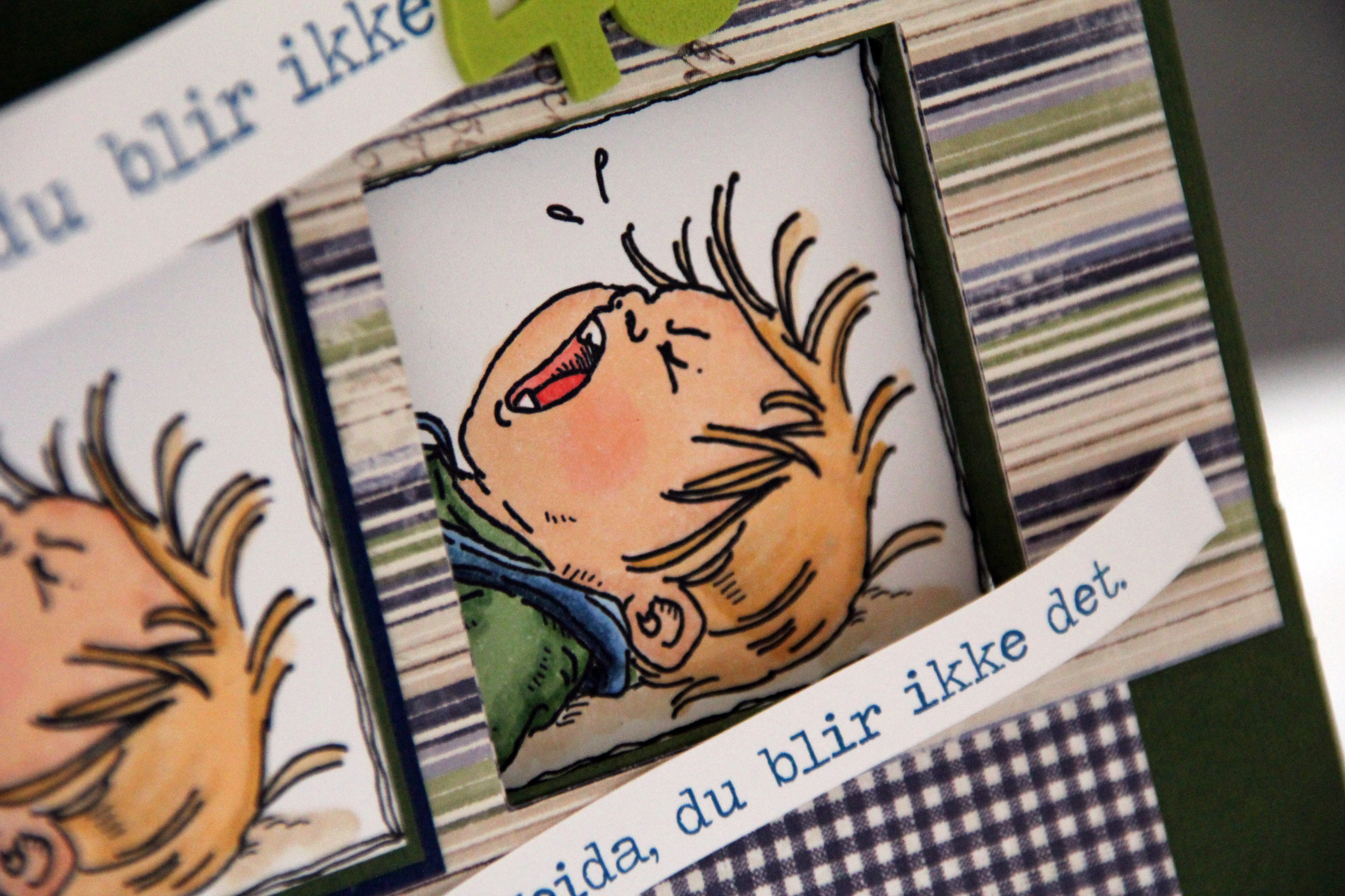 Det er ikke mye som minner om min vanlige stil på dette kortet, mitt eneste vanlige kjennetegn på dette kortet er svertede kanter, og jeg har til og med brukt helt andre farger på svertingen enn vanlig. Det går stort sett i Vintage Photo og Creamy Brown på mine kort, men her har jeg brukt Weathered Wood på det blå mønsterarket og Walnut Stain på kraftkartongen.
