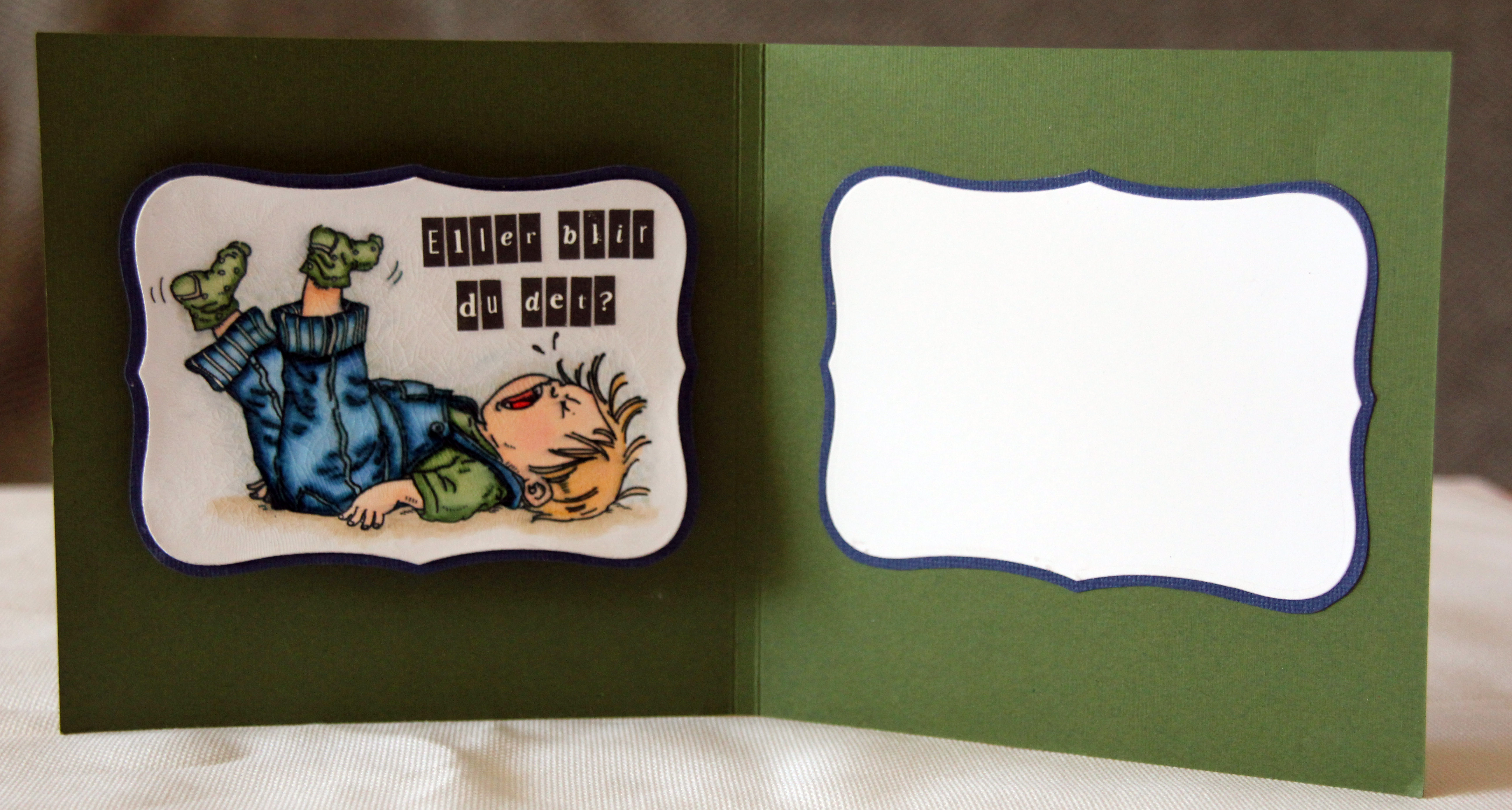 I’ve been inspired by the birthday card Henrikke sent me, that’s why pretty much everything on the front of this is mounted on 3D cushions. I had to get the large doily die when I got that card. I use a lot of doilies, so I consider it a good investment! I glued the patterned paper on some grunge board and die cut the car and the arrow. Sticking to my new rule of always using leftover patterned paper on my cards, this blue paper is a leftover from an old sheet from My Mind’s Eye’s Bohemia line. The paper is Bluebird “All Boy” Stripe/Light Blue. I’ve used the light blue (bordering on pale teal) side of the paper, it has a little bit of life in it, it’s not a “flat” blue.