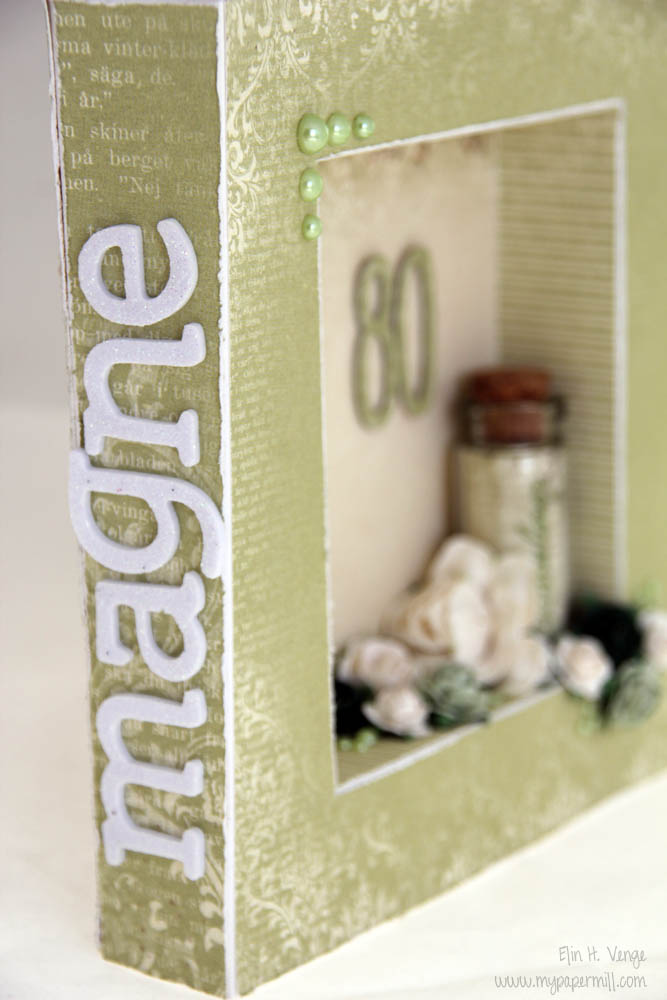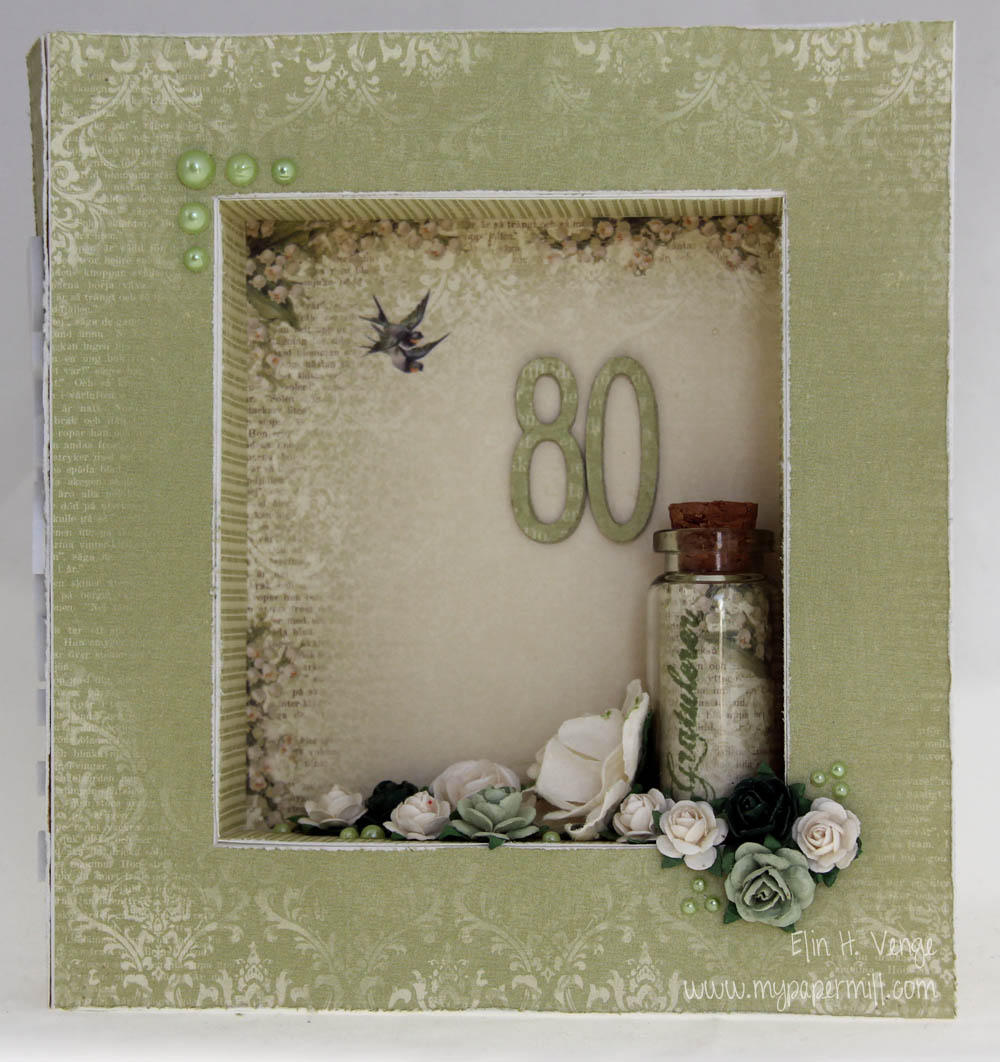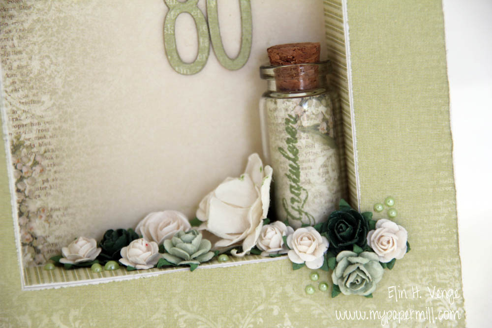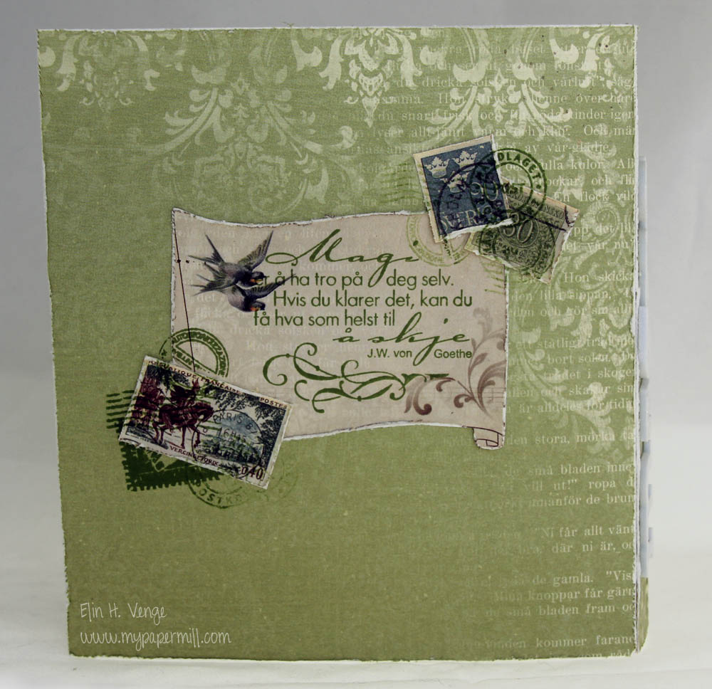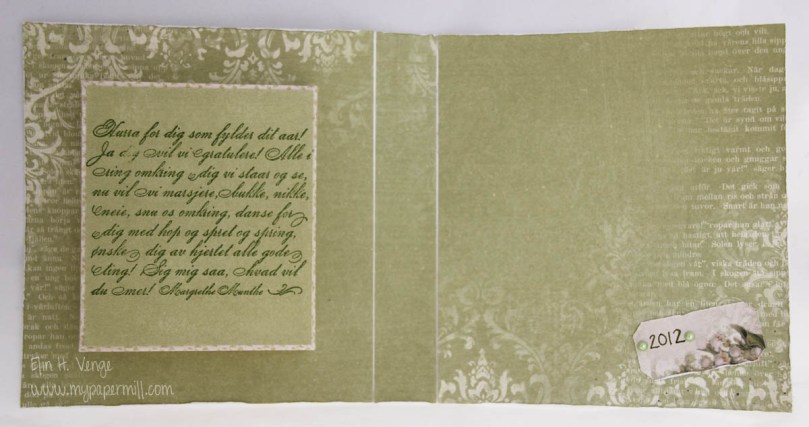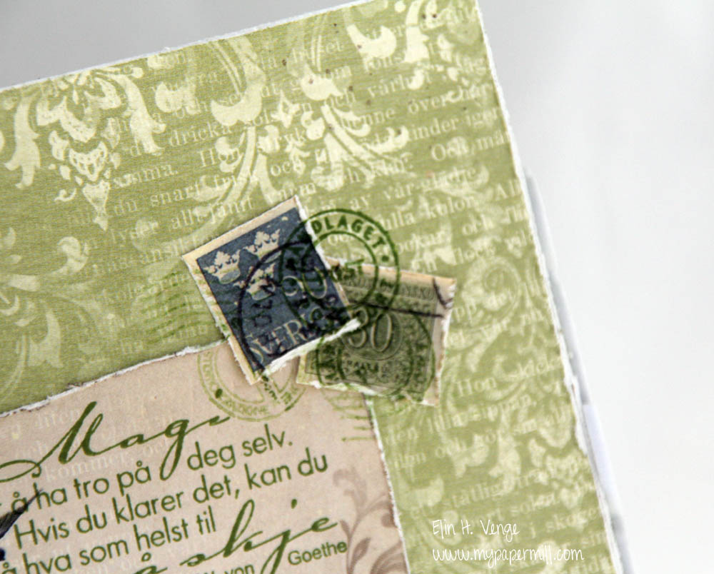 The car has been stamped with a stamp from Tim Holtz’ Steampunk collection with distress ink Iced Spruce (which was a mistake) and then clear embossed. I was supposed to use Weathered Wood, but Iced Spruce was also on my table, and in all the chaos it wound up being used on the car. The arrow is also clear embossed, but it has been inked on the edges first with Weathered Wood. I’ve used Dymo letters that I’ve cut and made smaller to use on top of the arrow. The finger pointing stamp is also from the Steampunk collection. The numbers are white thickers (Giggles) from AC. I found some buttons in brown and blue/teal that I’ve used with white scrapper’s floss from Karen Foster. “Gratulerer med dagen” (Happy Birthday) is printed on plain copy paper and then inked on the edges with Weathered Wood and put in a glass vial from TH.