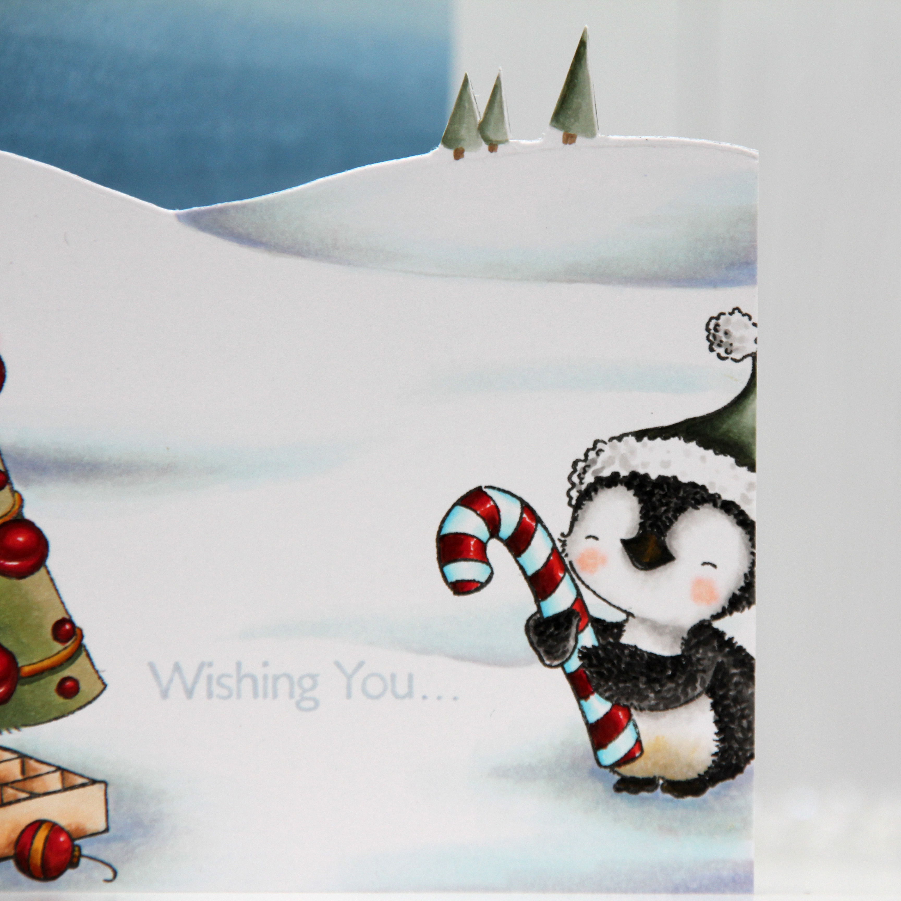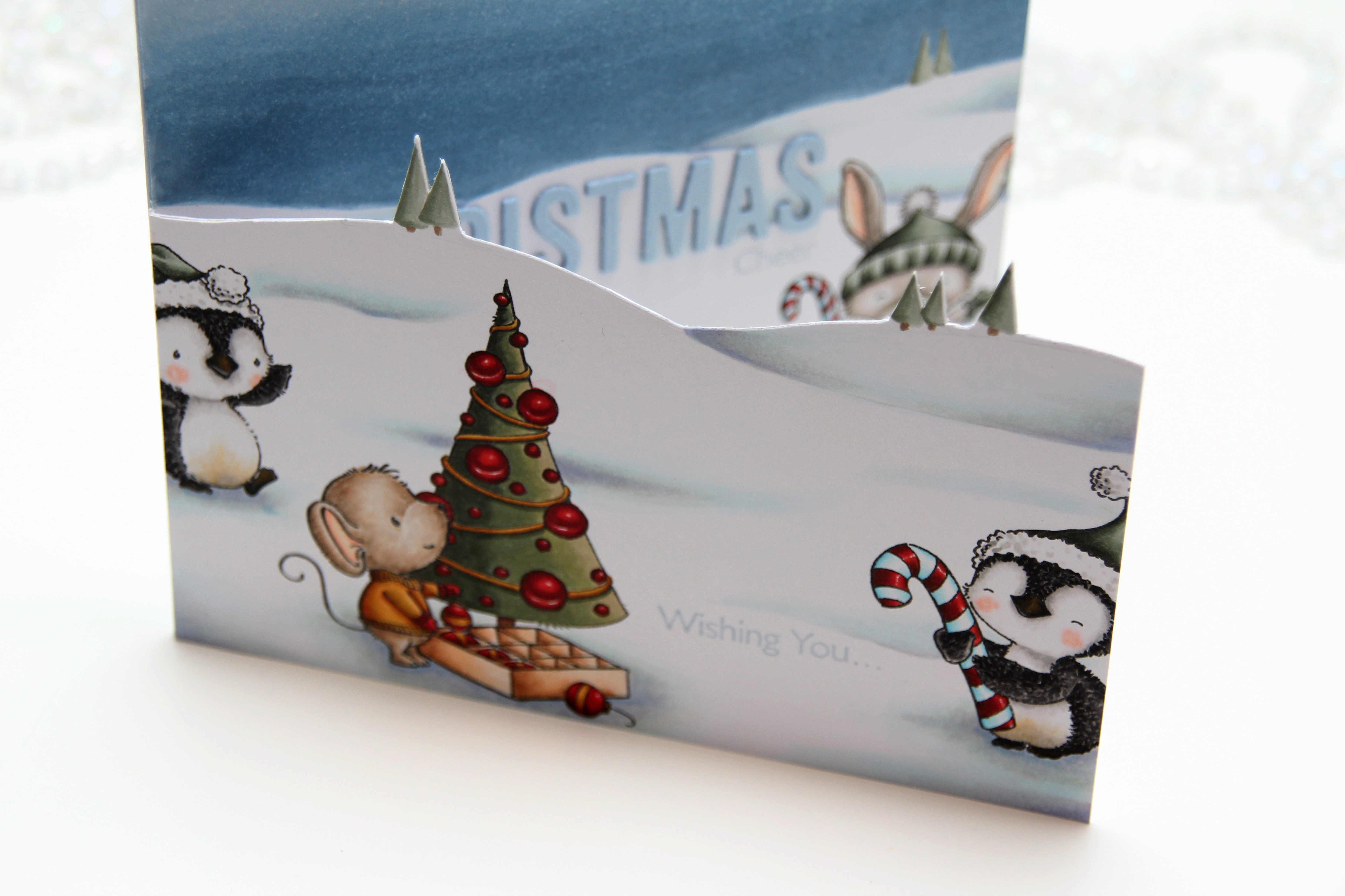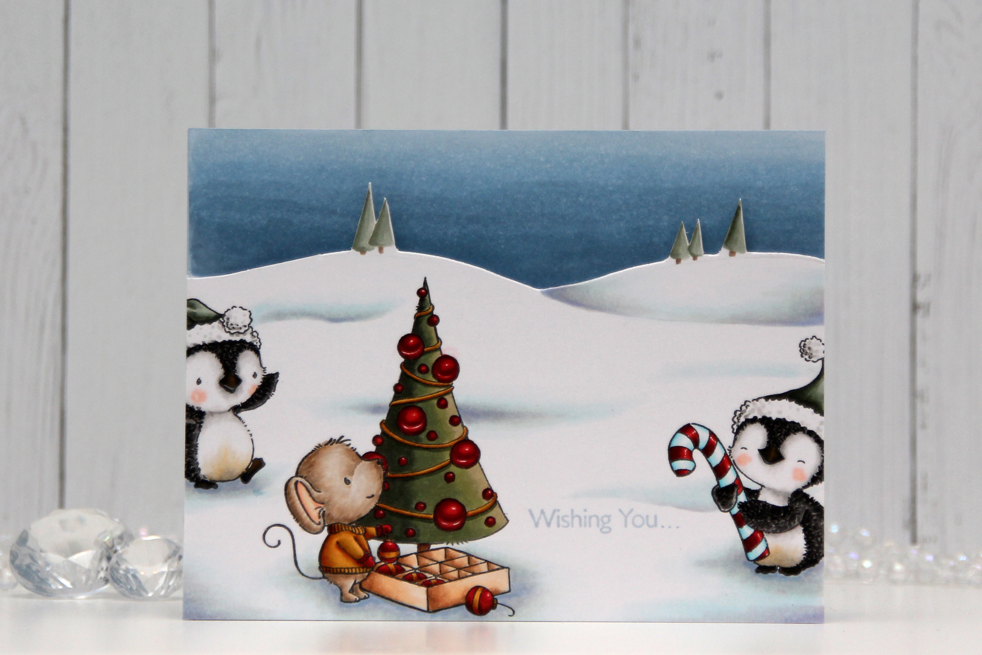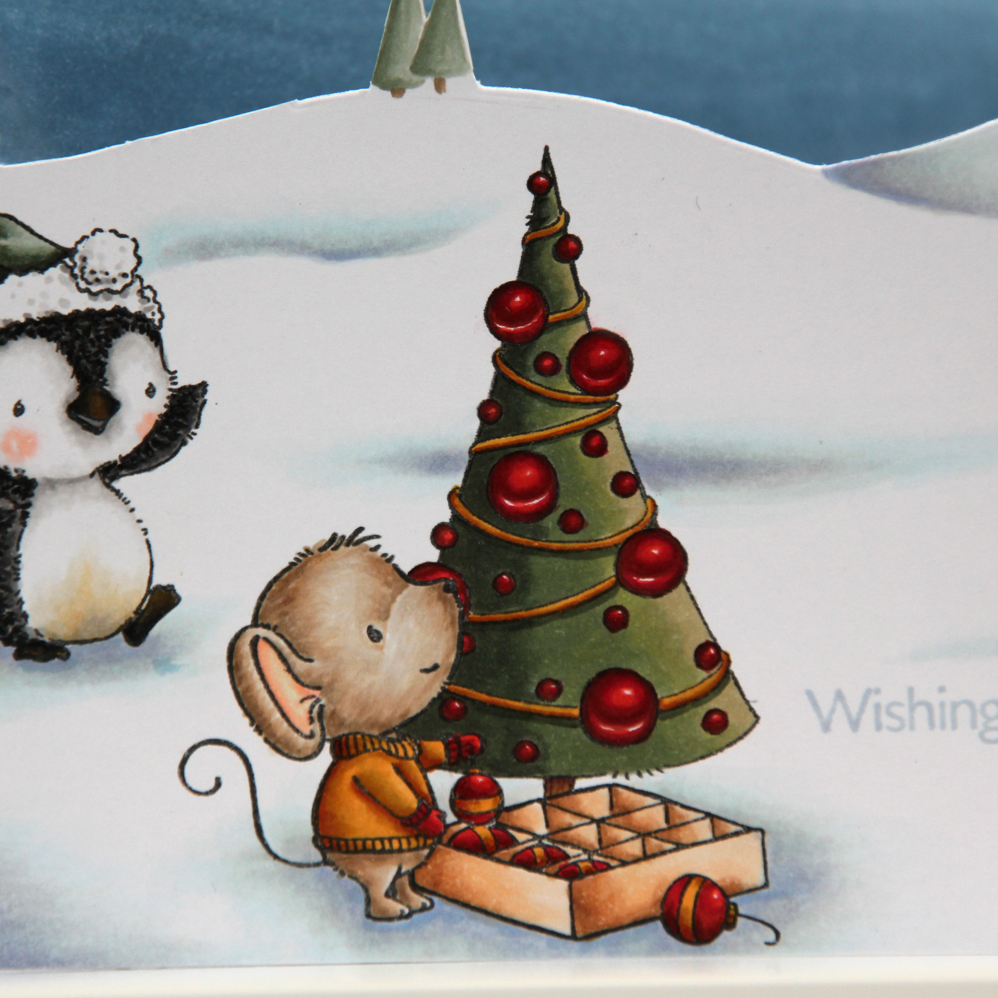 I stamped a couple of penguins running into the scene to assist the little mouse decorating the tree. The sky that you see at the top is actually the inside.