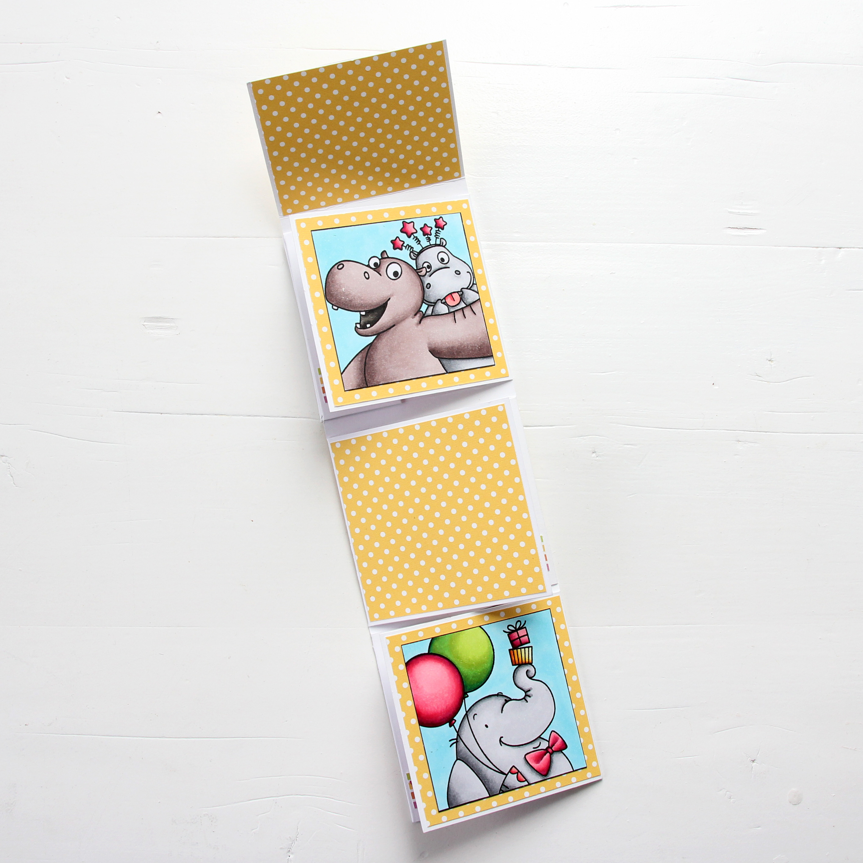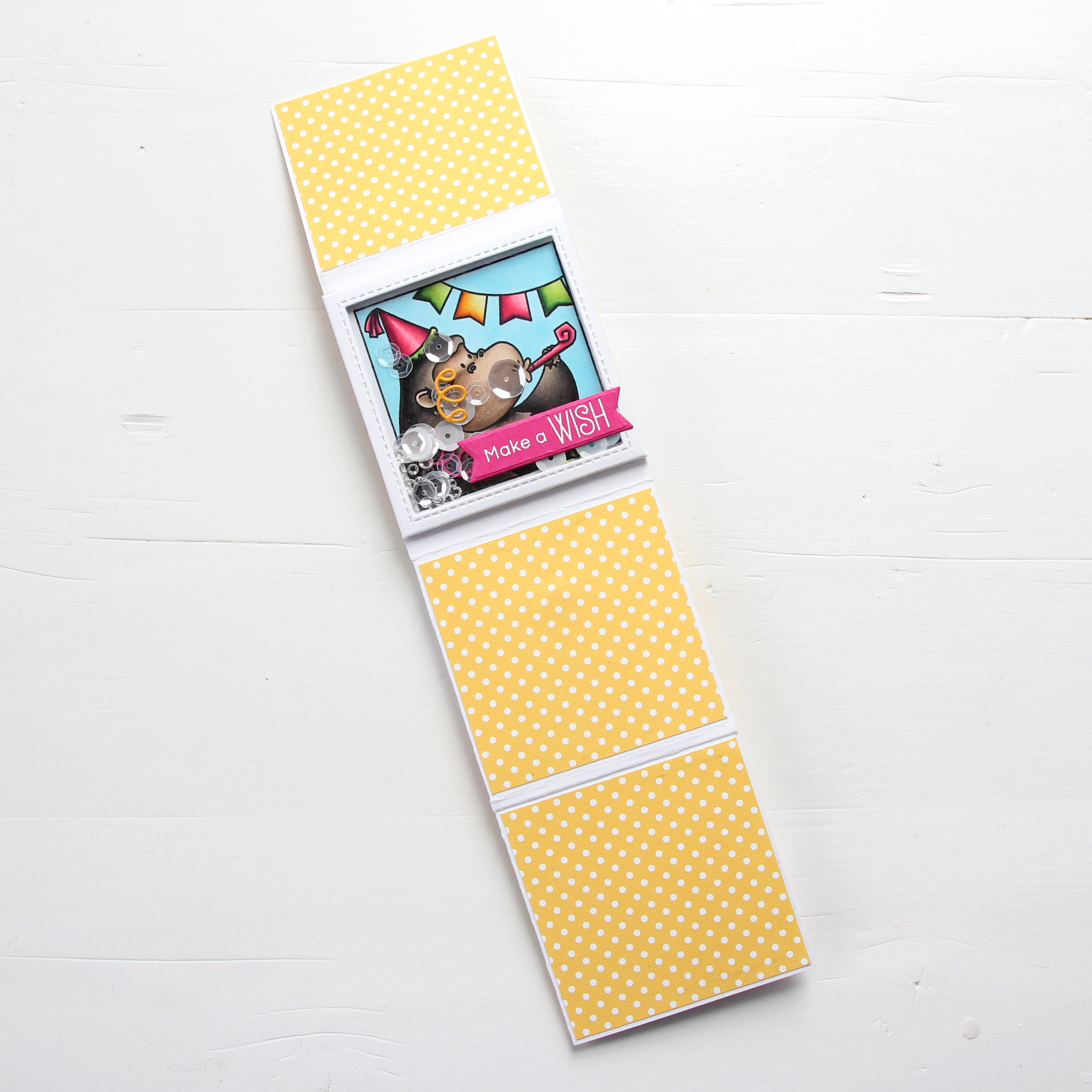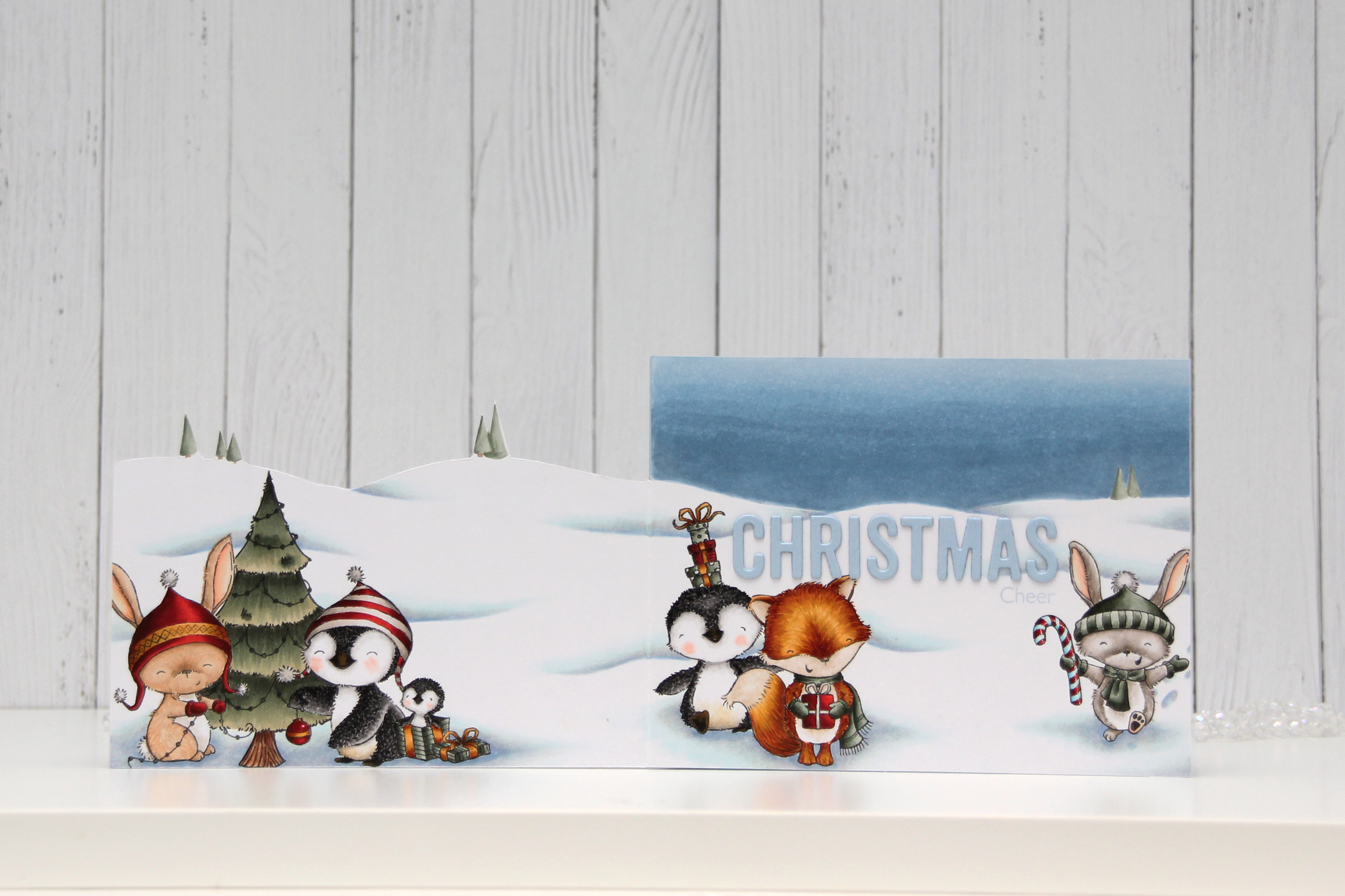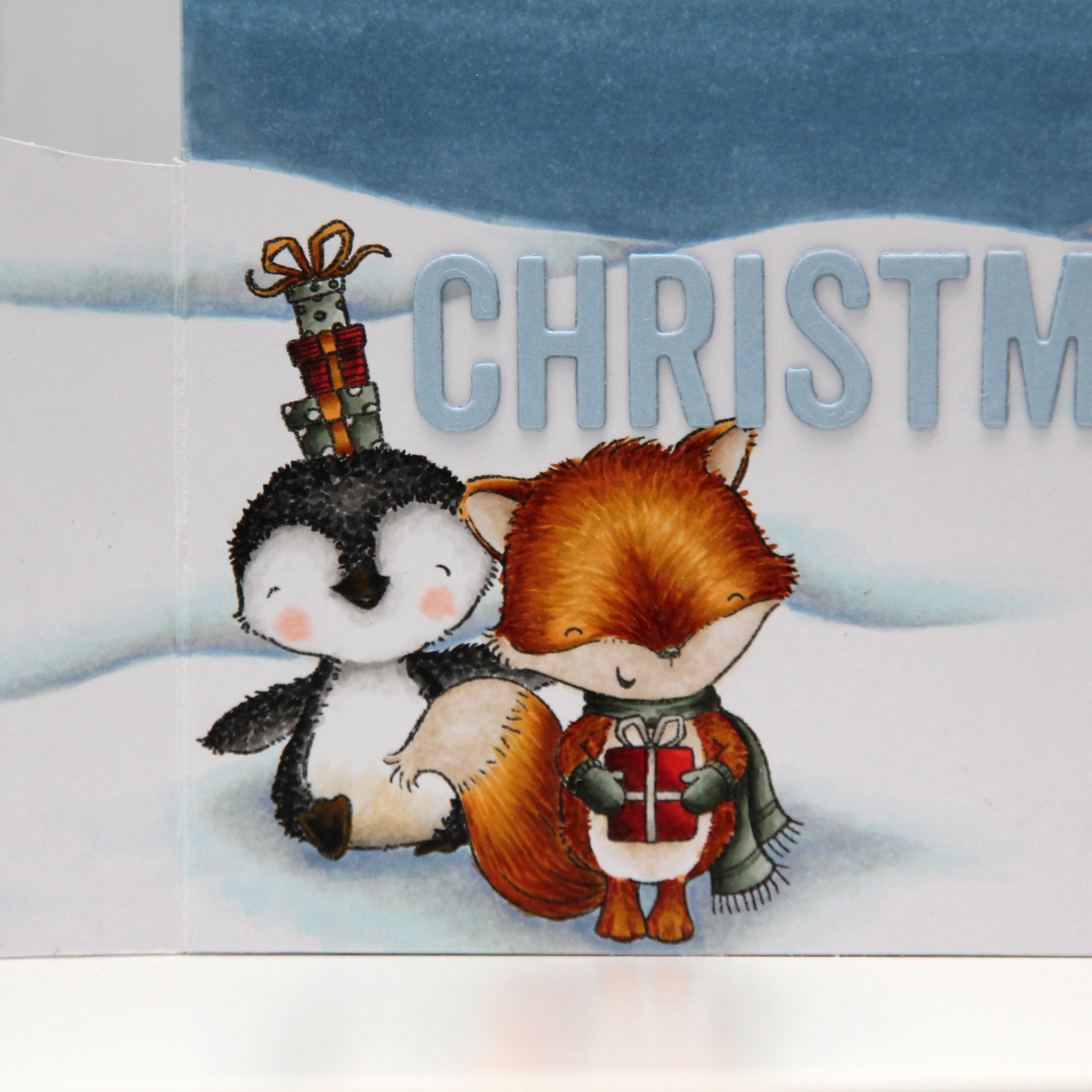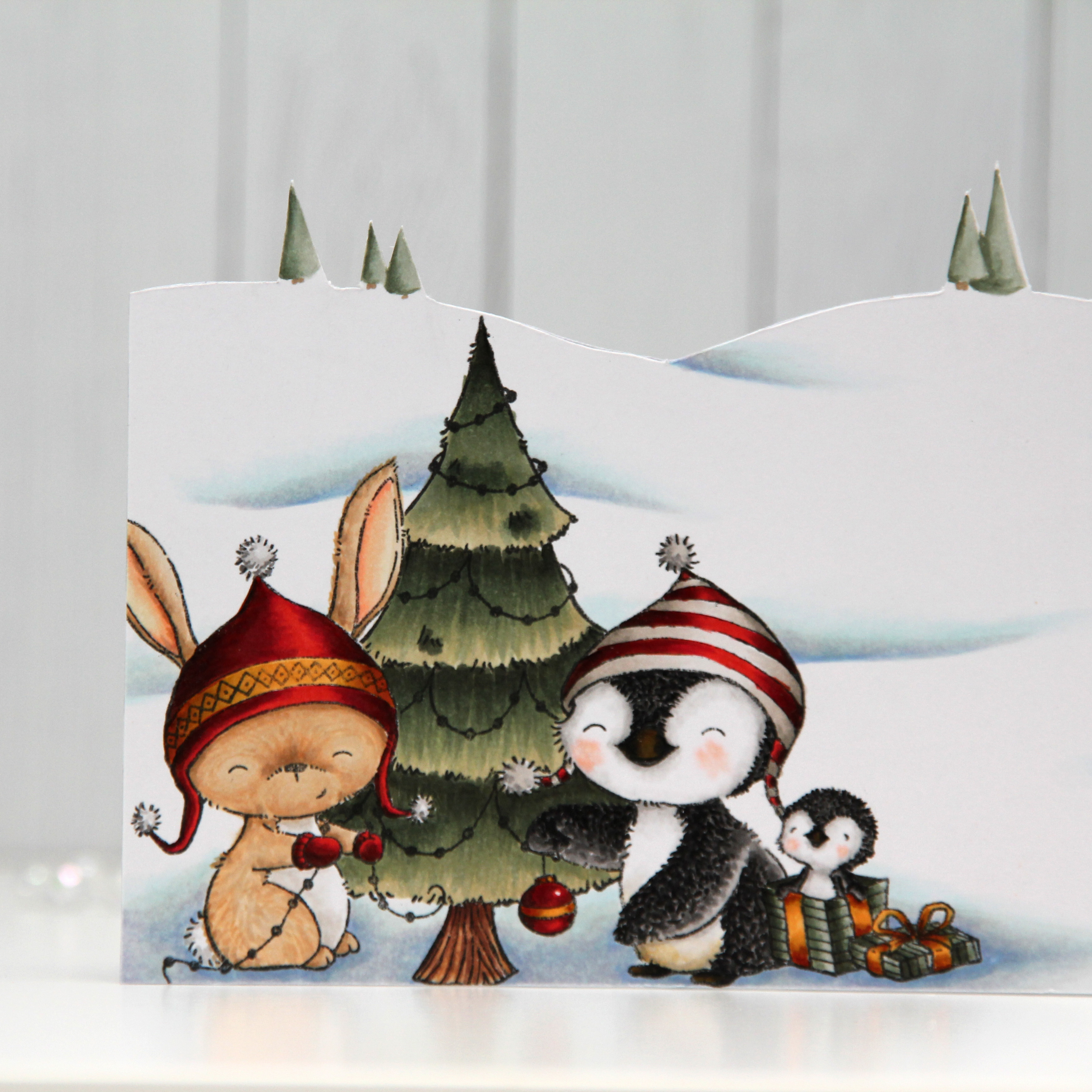 I stamped a couple of penguins running into the scene to assist the little mouse decorating the tree. The sky that you see at the top is actually the inside.