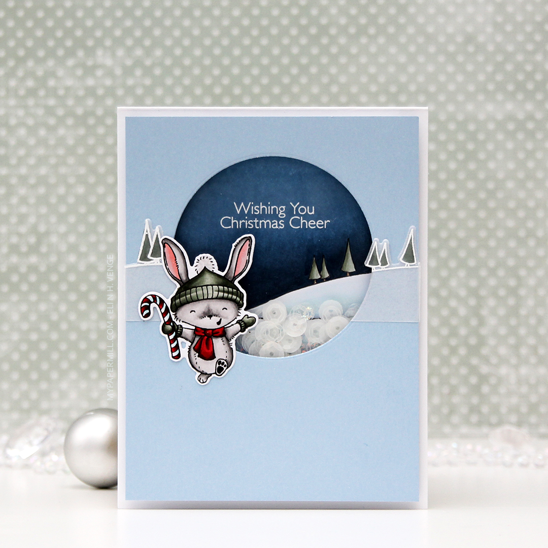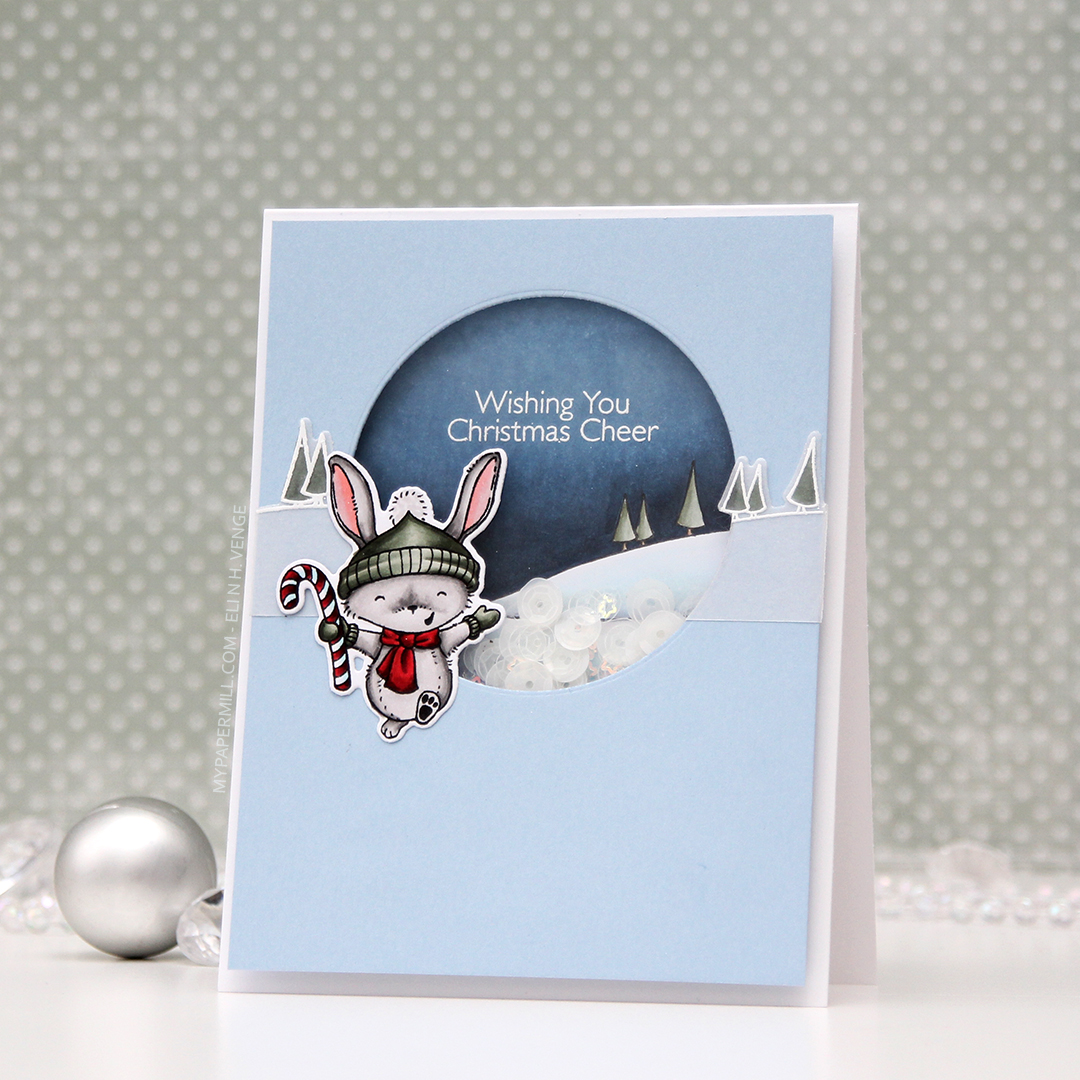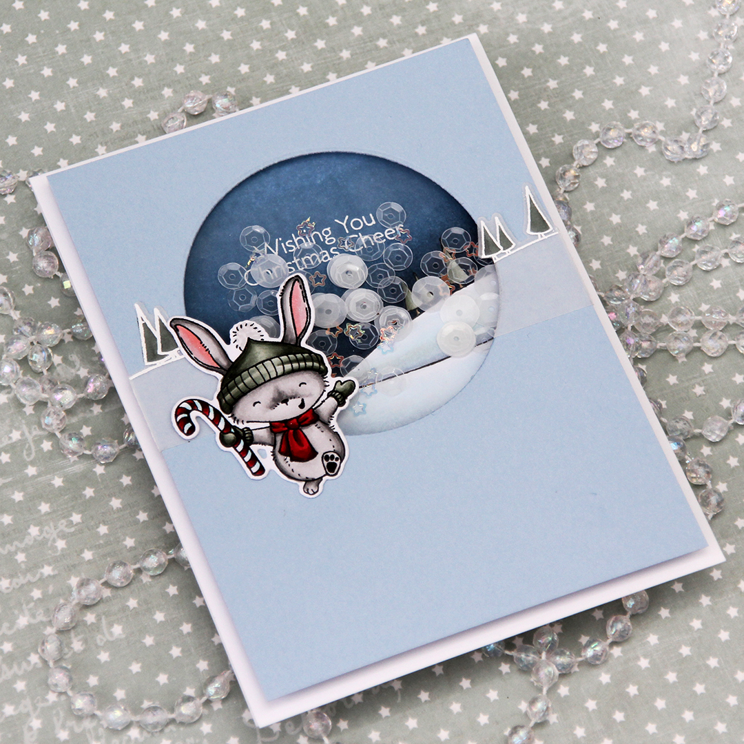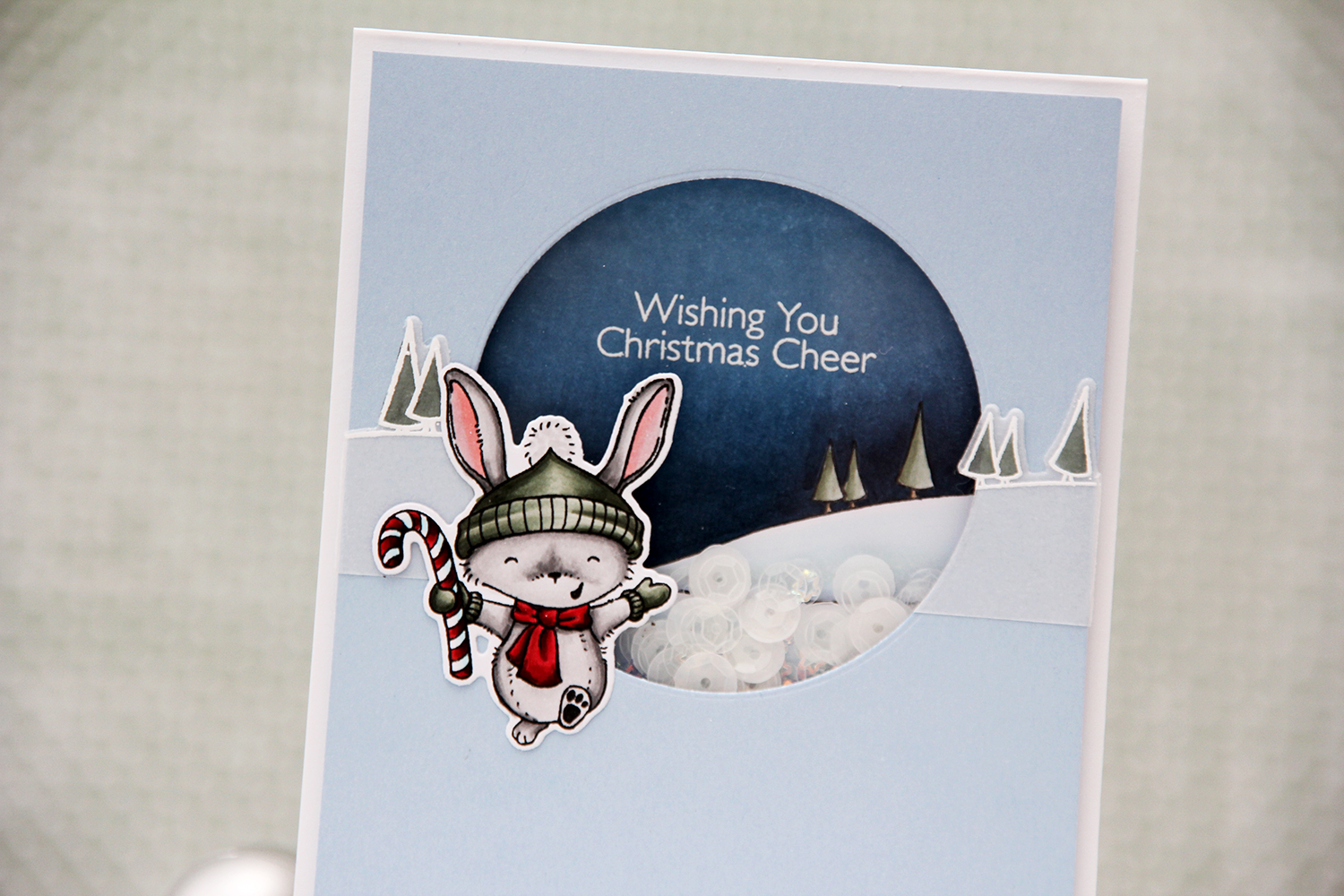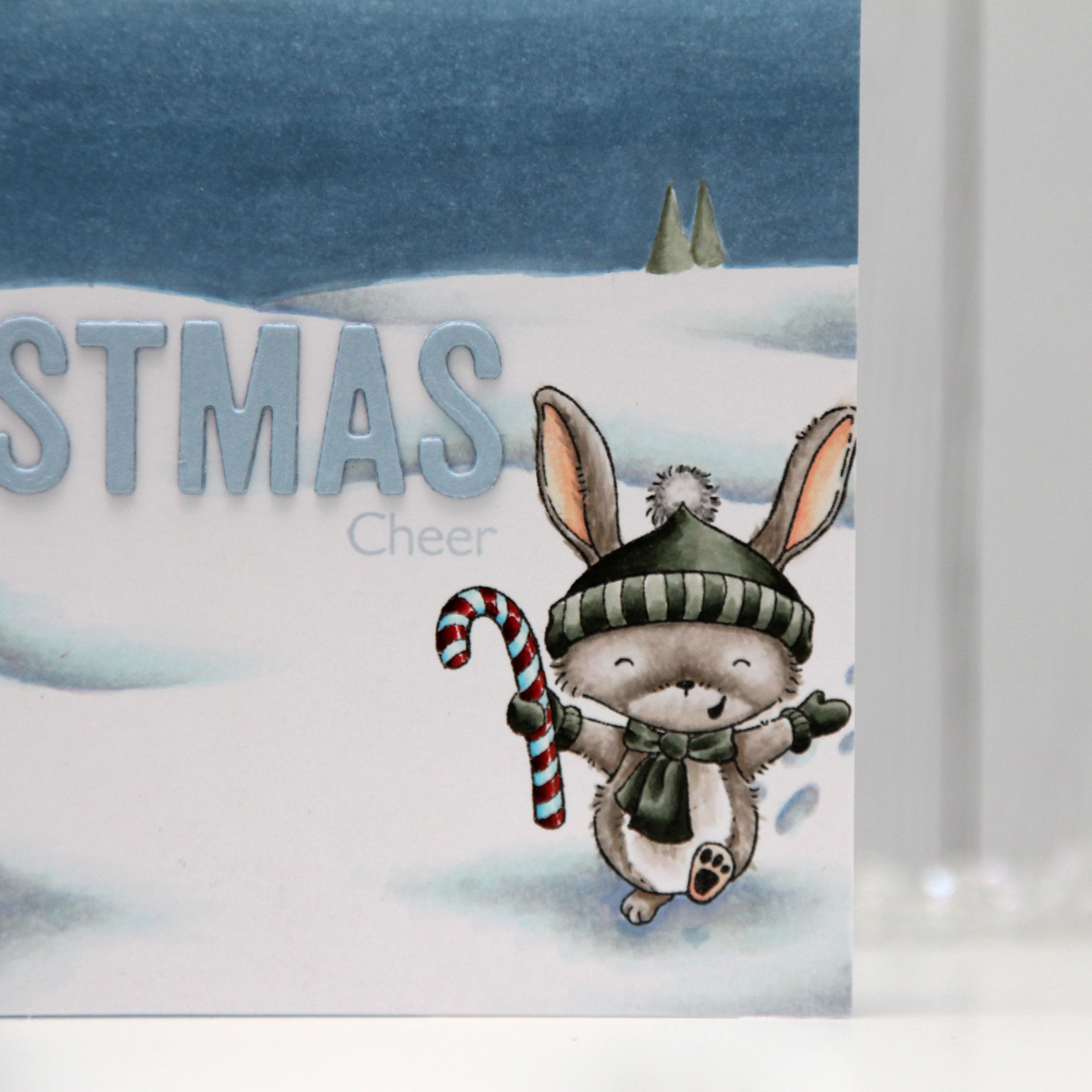 And this is it. Another Christmas tree, a couple of bunnies, a few more penguins and the rest of the sentiment. I had so much fun coloring this, and kept everything else very simple. I used the new Sending Christmas Joy die to die cut the letters for Christmas twice from Blue Breeze card stock. I glued the two layers together for each of the letters and added it below my horizon line. I’d planned this out carefully so there would be room between the stack of presents on the penguin’s head and the bunny’s ear on the right. I stamped the word Cheer from the Christmas Cheer stamp set in light blue ink right over my coloring. I’m glad I didn’t mess that up!