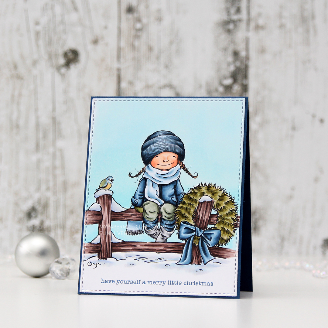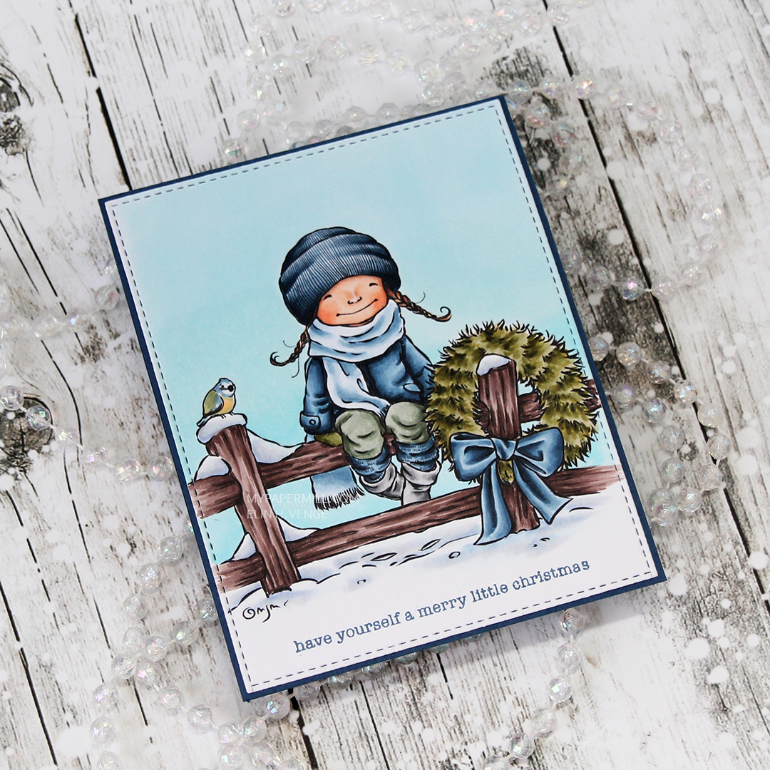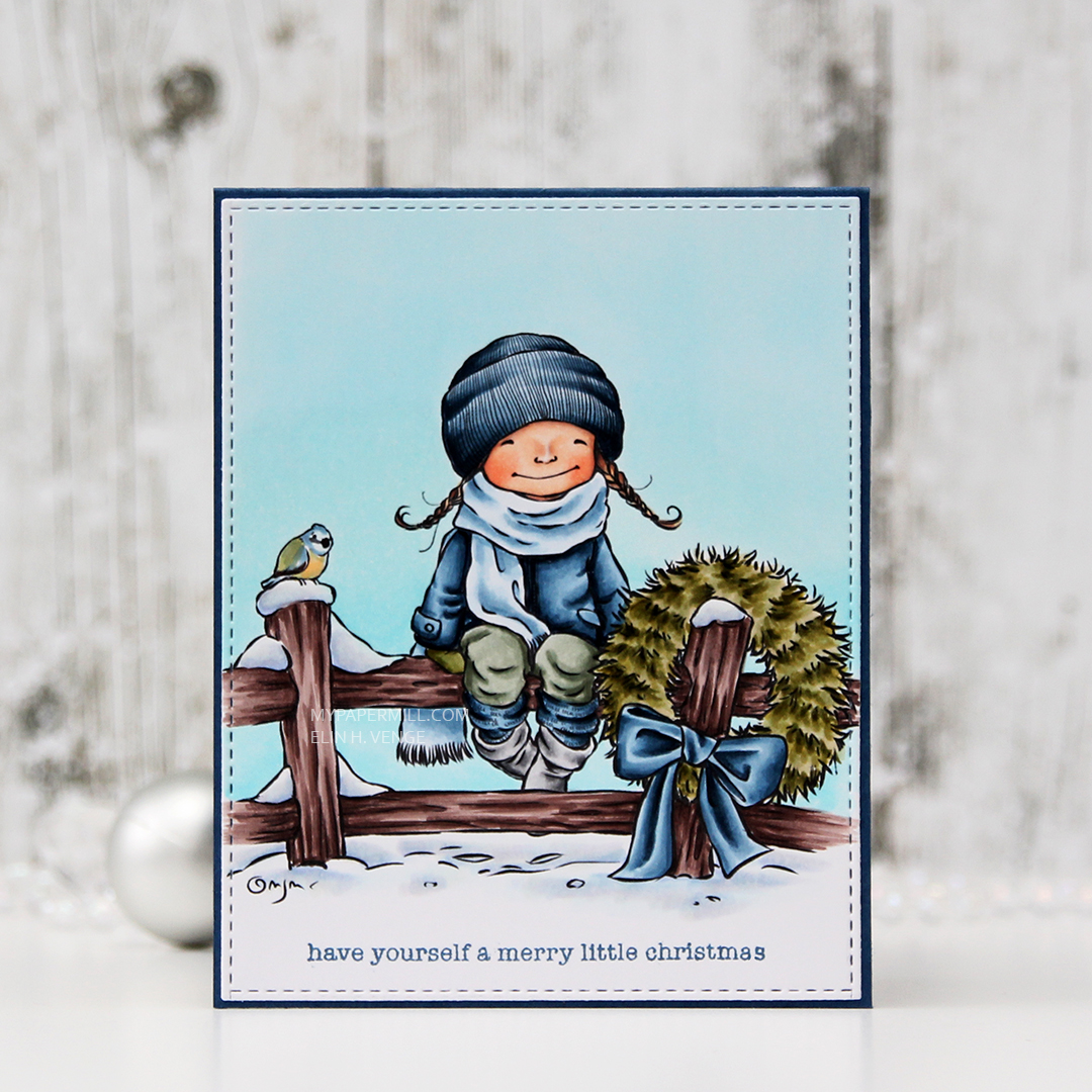 Speaking of – here he is. Warm gray fur, with a hint of E43 here and there. He’s holding a tiny candy cane, and I somehow managed to get 5 different red shades in there. I wanted it to look like he was entering the card from the right, so I made footprints behind him in the snow.