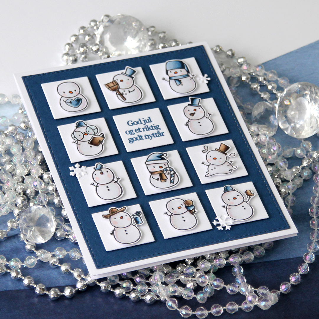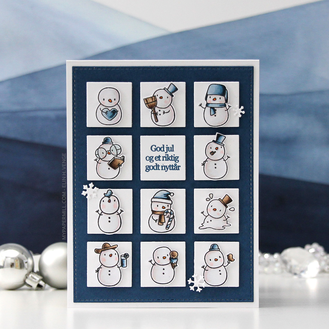 Speaking of – here he is. Warm gray fur, with a hint of E43 here and there. He’s holding a tiny candy cane, and I somehow managed to get 5 different red shades in there. I wanted it to look like he was entering the card from the right, so I made footprints behind him in the snow.
