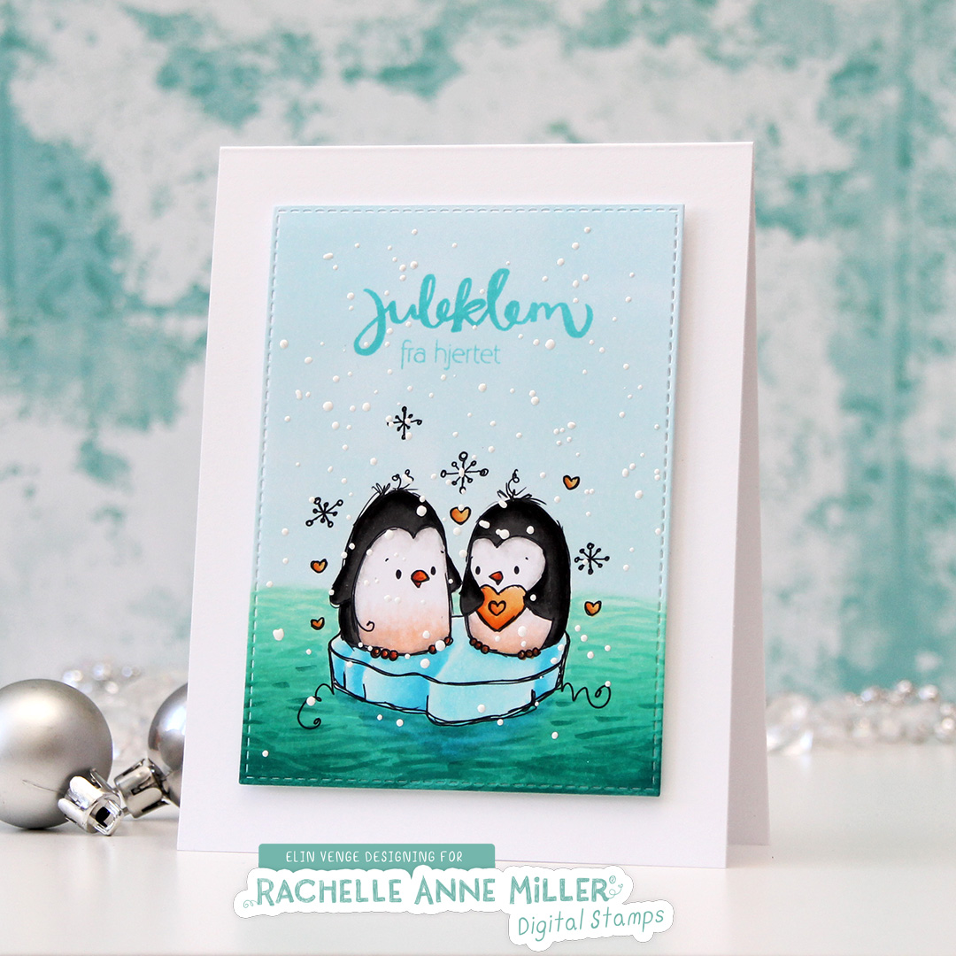 And this is it. Another Christmas tree, a couple of bunnies, a few more penguins and the rest of the sentiment. I had so much fun coloring this, and kept everything else very simple. I used the new Sending Christmas Joy die to die cut the letters for Christmas twice from Blue Breeze card stock. I glued the two layers together for each of the letters and added it below my horizon line. I’d planned this out carefully so there would be room between the stack of presents on the penguin’s head and the bunny’s ear on the right. I stamped the word Cheer from the Christmas Cheer stamp set in light blue ink right over my coloring. I’m glad I didn’t mess that up!