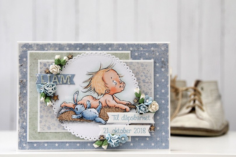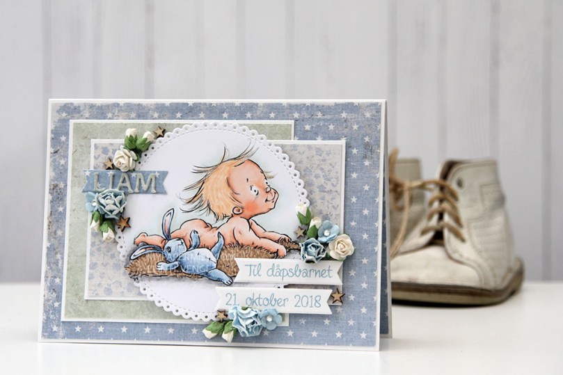 I decided to go with patterned papers from Maja Design. These are from the Vintage Baby and Sofiero collections. I added his name in tiny diecut letters and embellished simply with flowers, some Kort & Godt diamonds, and some Studio Calico veneer stars. I thought they went well with the stars in the patterned paper.