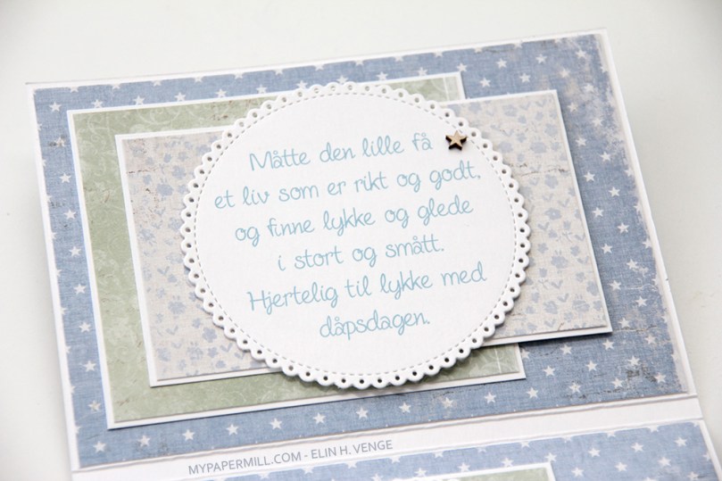 The card was too thick to fit inside a regular envelope, so I created a box envelope using a punch board from We R Memory Keepers. Onto a diecut eyelet circle I stamped a Norsk Stempelblad AS sentiment and adhered it to the box envelope.