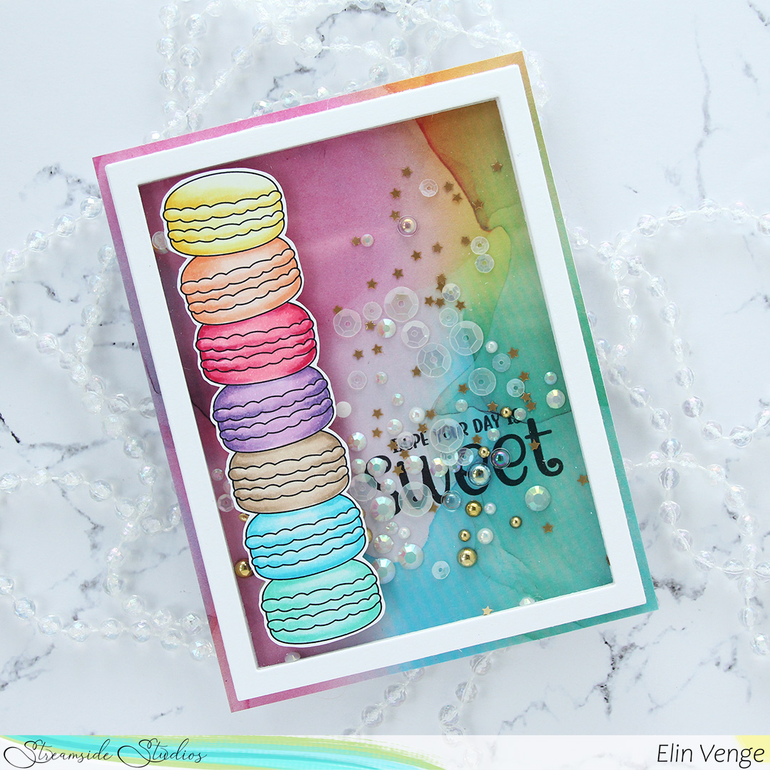 I cut down a piece of patterned paper from the Ink Drops – Vivid paper pad from Craft Consortium. I chose this particular sheet because the colors I used for the macarons are well represented in the paper. I printed the sentiment directly onto the patterned paper and adhered it to a top fold card base I created from Stamper’s Select White cardstock from Papertrey Ink. I die cut the largest frame in the Classic Rectangle Frames die set from My Favorite Things 9 times from white cardstock. I stacked them and adhered them to the card front, before adding sequins and gems to the well. The sequin mix I used is the Vanilla Kiss mix from Little Things from Lucy’s Cards. I adhered a few around my sentiment to keep them from falling to the bottom, then sealed my shaker well with a piece of acetate from Simon Says Stamp. I added one final white die cut frame on top of the acetate for a clean look and also adhered the stack of macarons to finish the card.