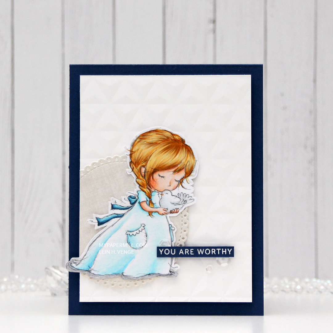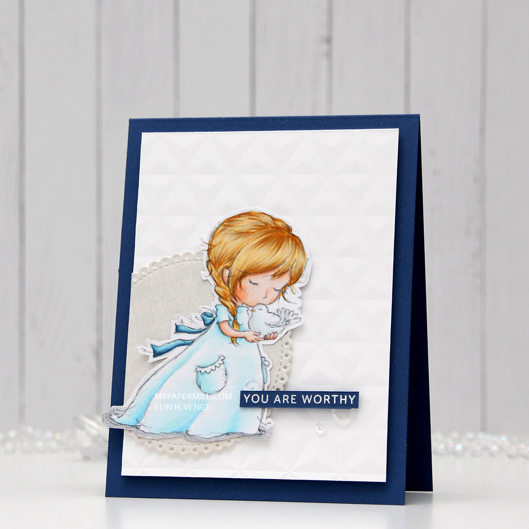 After die cutting an eyelet circle from a Cottage Cutz die set using a piece of patterned paper from DCWV, I did some aggresive cropping to one side and mounted the remainder of the circle on my dry embossed white card stock using 1 mm foam squares. I added the white panel to the card base using regular foam tape, and added the girl on top of the circle, before finishing off the card with a heat embossed sentiment from an Altenew stamp set and a few sequins from the White Orchid sequin mix from Little Things from Lucy’s Cards. The blue card stock is Blueberry from My Favorite Things.