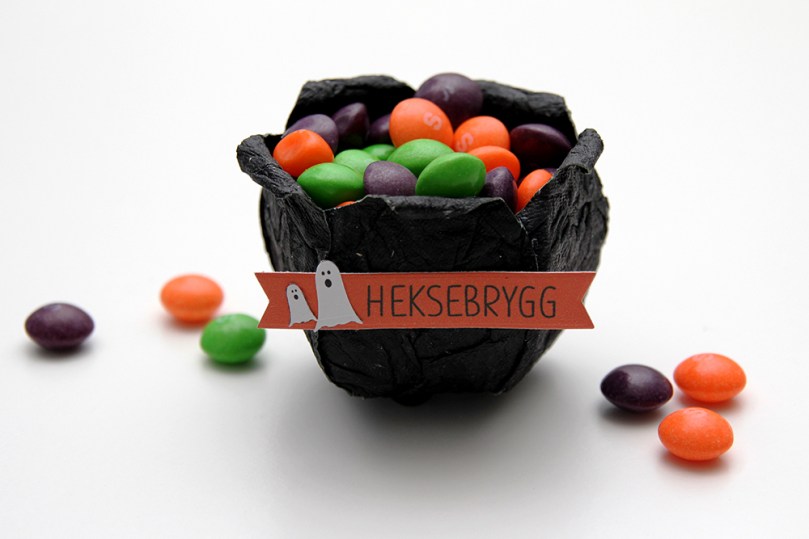 Jeg bygde heksegryten min av kartong som allerede er full av rynker. Det gir en litt morsom tekstur allerede før du begynner. Jeg prøvde meg frem litt og endte opp med å lage en mal for meg selv. Jeg lagde fem like biter som jeg limte sammen for å lage gryten min. Øverst krøllet jeg kartongen utover, så jeg fikk en litt pyntet kant. Jeg satte halvperler under gryten som føtter, og skrev teksten ut fra Photoshop på kartong og limte på siden av gryten. Jeg limte på et par spøkelser fra et mønsterark fra Papirdesign som pynt.