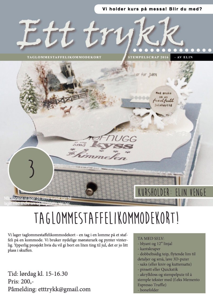 Jeg sitter og jobber med oppgavene mine til desembernummeret av Ett trykk, men en pause er på sin plass for å nevne at jeg holder kurs i taglommestaffelikommodekort på årets StempelScrapmesse i Exporama-hallen på Hellerudsletta. Kurset varer 1,5 time lørdag 24. september klokken 15.00 og koster kr 200,-. De andre jentene i designteamet holder også kurs, gå inn på Ett trykk-bloggen for mer informasjon og påmelding. Håper vi sees!