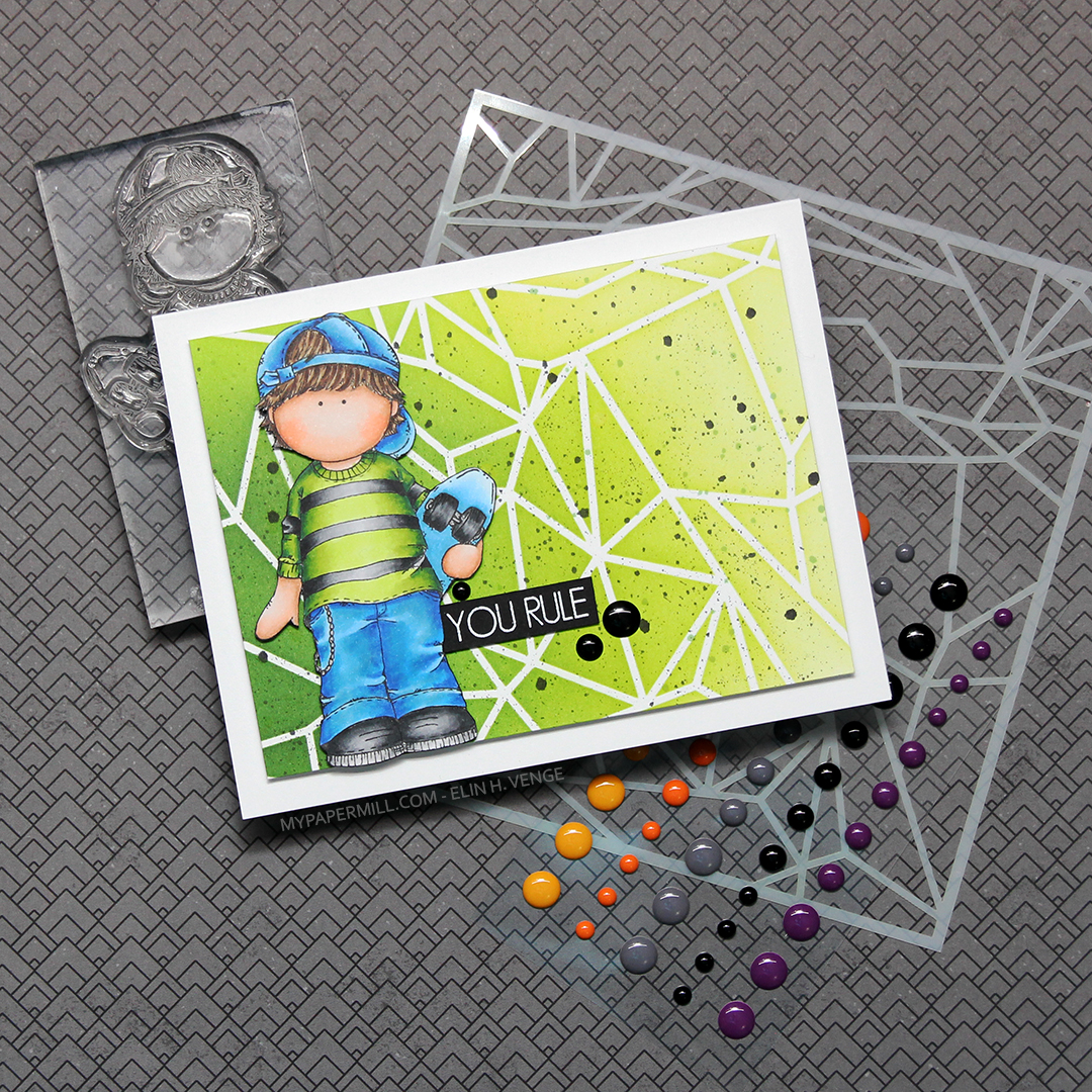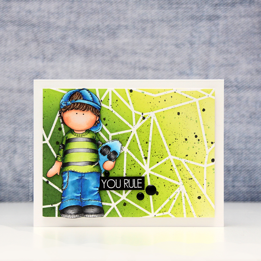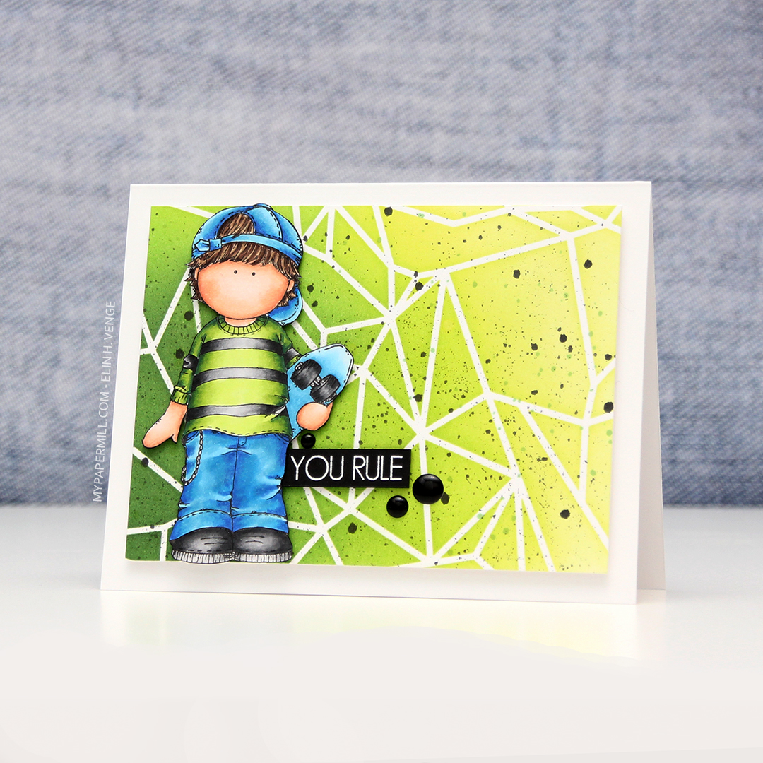 I colored the skater boy using Copics, then fussy cut him right up against the black stamped lines.