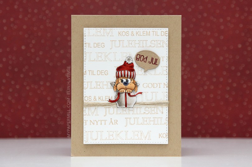 Det siste kortet ut er av slaget som ser veeeldig enkelt ut. Og det er det forsåvidt også, men det er mer tidkrevende enn man kanskje først skulle anta. Her har jeg nemlig først stemplet lua fra julehunden over et helt panel hvit kartong med lysegrått blekk. Det tar tid å maskere stempelet, legge på blekk, fjerne masken og stemple så mange luer, men jeg ble kjempefornøyd med resultatet, så det kan fint hende jeg gjør dette senere en gang også.
