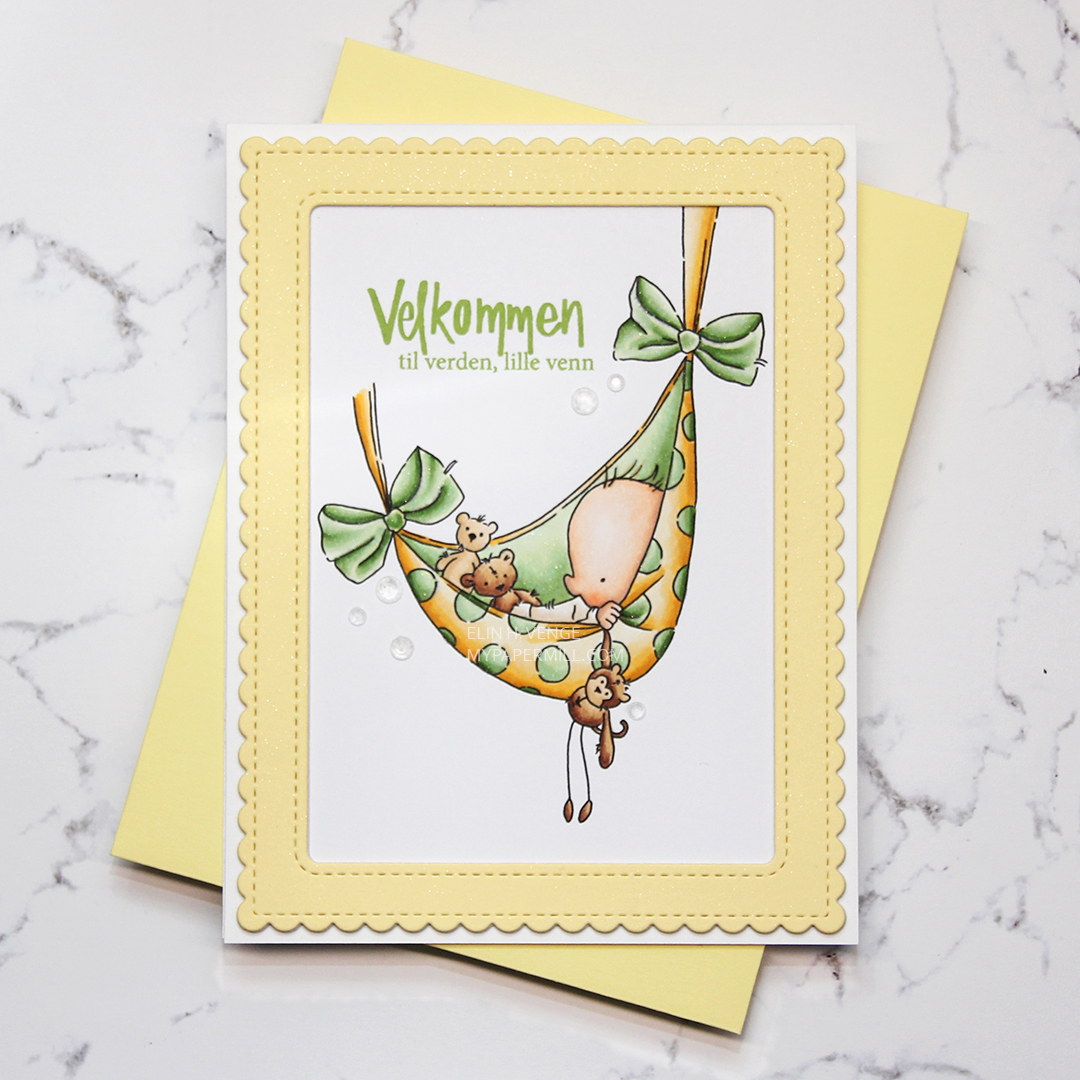 I had trouble deciding whether to make a card for a baby girl or for a baby boy, so I decided to go somewhat neutral with a combo of yellow and green. I colored the image with my Copics, added a clear coat of glitter on the green areas using a Wink of Stella glitter brush.