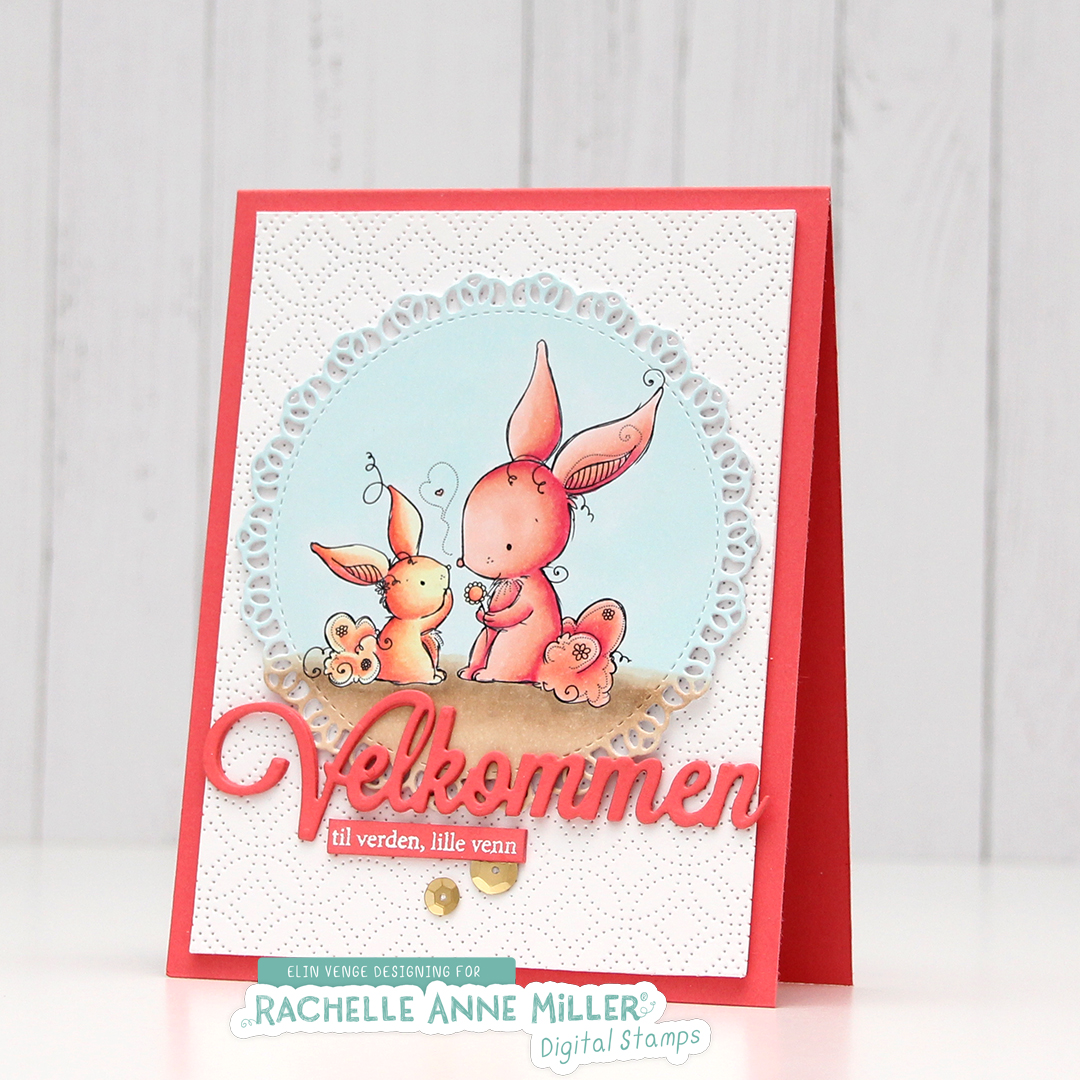 I wanted a soft look to this, but at the same time, I also wanted to change things up a bit. I went with a darker skin tone than I normally do, and I really wanted a soft yellow bunny. I printed the image onto a piece of X-Press It blending card cut to 3×6″ for a mini slimline card. I adhered it to a card base I made from Lemon Tart card stock from Papertrey Ink with a 1/8″ border. I used the same color card stock to die cut “God påske” (Happy Easter in Norwegian) using a die from Papirdesign. I stacked three die cuts on top of each other and used a sparkle shimmer spray from Imagine to add lots of shimmer to the die cut. It has a really nice shimmer in real life, even though you can’t see it in the photo. To finish off the card I added a few sequins from the White Orchid sequin mix from Little Things from Lucy’s Cards.