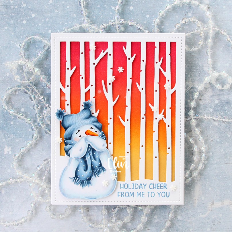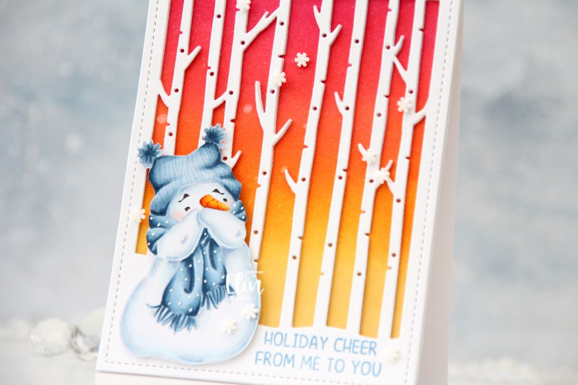 Directly onto the cardbase I ink blended Distress Ink in the colors Picked Raspberry, Worn Lipstick, Spiced Marmalade and Scattered Straw to create an intense winter time sunset and create some contrast between the cool colors of the snowman and the background. I misted it generously with a sparkle shimmer spray which catches the light nicely when you tilt it, but it doesn’t really show up in my photos (except for a couple of bigger drops). I wanted to ink blend directly onto the cardbase because I knew I was putting lots of layers of die cut cardstock on top, and I didn’t want the card to be too front heavy.