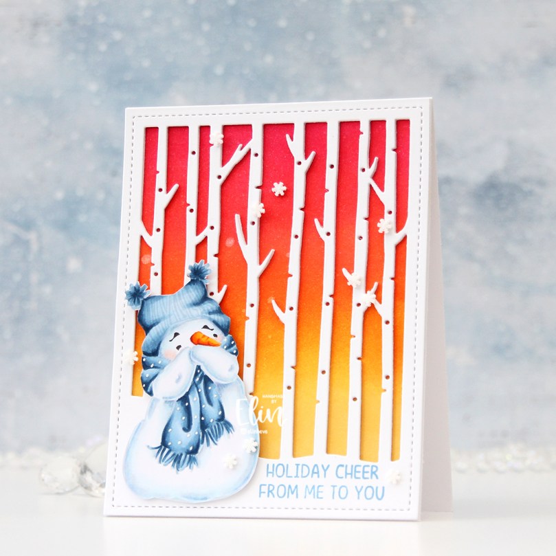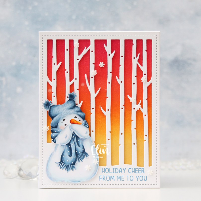 Speaking of die cut cardstock. I used the Winter Forest Cover die from Mama Elephant to die cut three layers of white cardstock and glued them together for dimension, before adhering the stacked die cuts to the card base.