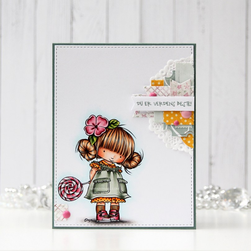 I use a couple of different dies to make these clusters, I make the banners using the Fishtail Flag Frames set from My Favorite Things, and I use the Happy Days Ticket Stubs die from Xcut for all those tickets. It’s one die that cuts nine different tickets, and I love that I get that many from one run through my diecutting machine. I mounted some of my diecut pieces on 1 mm foam tape, and glued others down using just double sided tape. Behind the whole thing I put half a mini paper doily from Doodlebug Design. I used the other half for the card I posted yesterday. On top I added a sentiment from Norsk Stempelblad AS stamped in Ocean Tides ink from Papertrey Ink. I mounted that on foam squares, and tripled up the foam squares on the left side of the banner. Finished off with a few pink dots from Papirdesign.