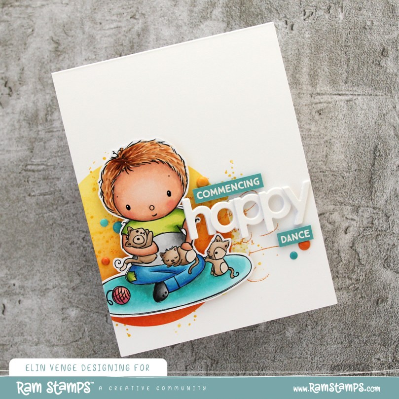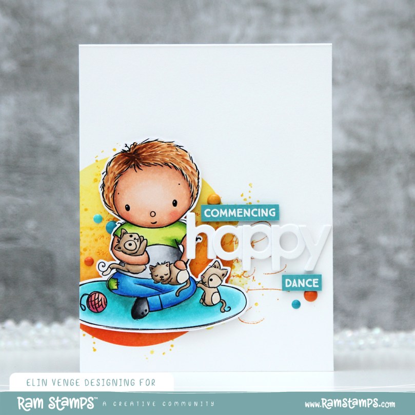 I stamped and white heat embossed a sentiment from the Anything-but-Basic Birthday Wishes stamp set from My Favorite Things onto a piece of Caribbean Sea cardstock, also from MFT. The sentiment actually says Commencing Happy dance, but since I already had a diecut happy, I only needed the first and last word for my card. I added three additional strips of cardstock behind the words for dimension, and finished off the card with a few enamel dots. The teal ones are from the Cool Summer Nights pack from Altenew, the orange ones from a Halloween pack from Papirdesign. I also added a dot of black Glaze pen to the kittens’ eyes and the boy’s eyes, then a white dot using the Gelly Roll 05 from Sakura once the black had dried on the boy.