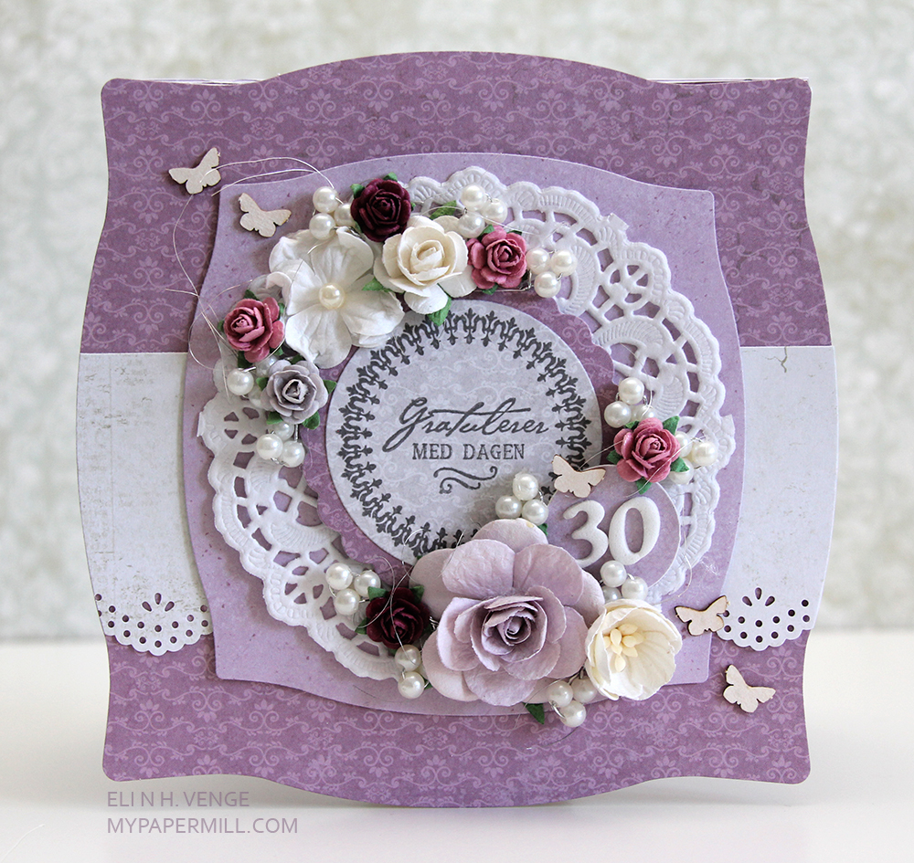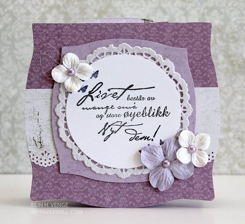 Cards like this come together very easily, it’s basically a bunch of diecutting and you’re done. I use two full 12×12 sheets of patterned paper for cards like this, and the beauty is that there are no scraps left when I’m done. For this one I used two sheets from Papirdesign, one is Roseduft, and the other is stemorsblomst, blå.