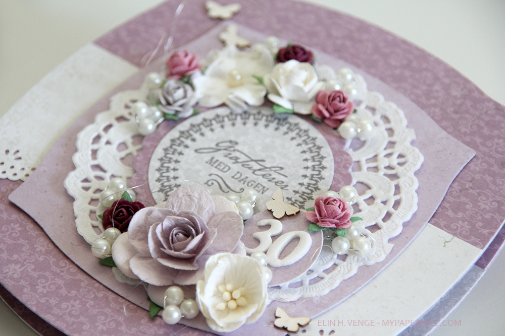I added a paper doily, some pink lace, some May Arts natural twine, a bow, a couple of diecut numbers and a few paper roses from Papirdesign, in addition to a couple of sentiment strips. I stamped the