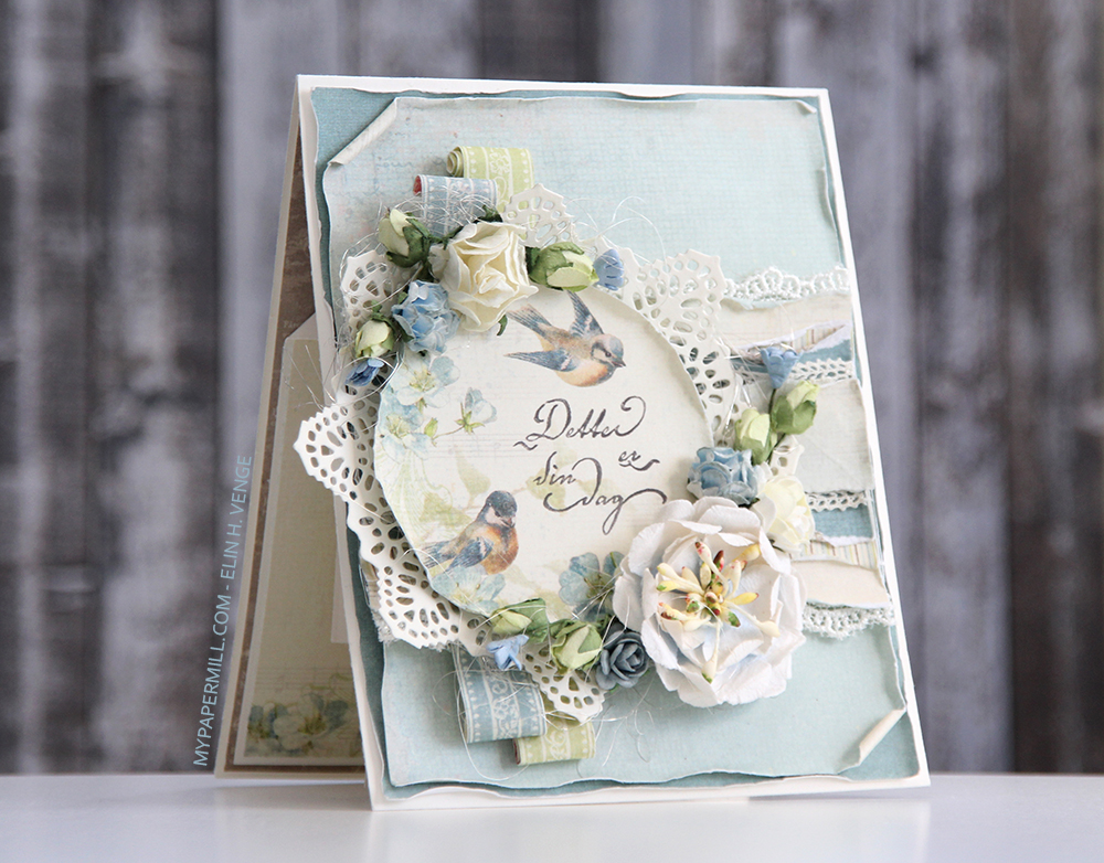 Jeg har brukt blomster fra Petaloo, Wild Orchid Crafts, Kort & Godt Hobby og Papirdesign på fronten, i tillegg til englehår fra Mester Grønn. Teksten kommer fra Papirdesign, og er stemplet rett på mønsterarket.