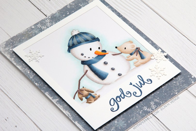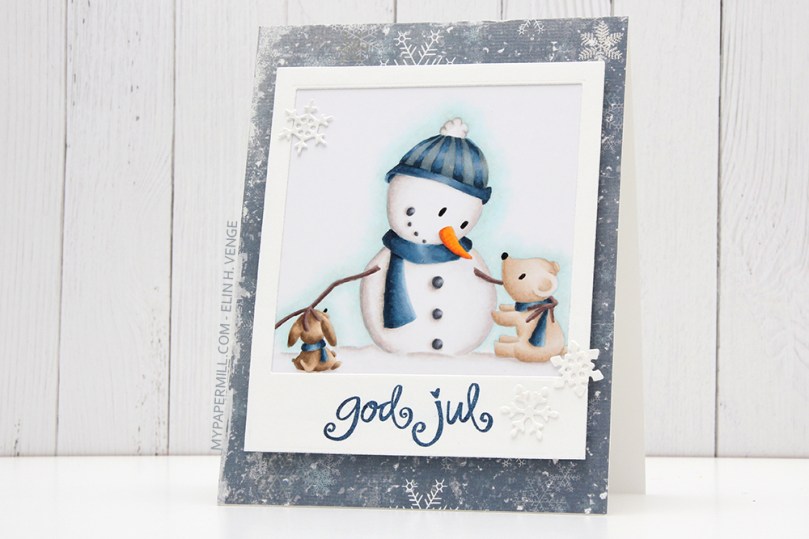 Jeg har printet ut motivet Snowman and Friends fra Kinda Cute by Patricia med veldig svak farge og fargelagt med no lines-teknikk. Kortet er egentlig uhyre enkelt, jeg har dekket hele forsiden med et mønsterark fra Joyous Winterdays-kolleksjonen til Maja Design, laget en polaroidramme av hvit kartong som jeg har montert motivet inni, stemplet en Norsk Stempelblad AS tekst med blått blekk fra Papertrey Ink og pyntet enkelt med diecutsnøfnugg fra Marianne Design.