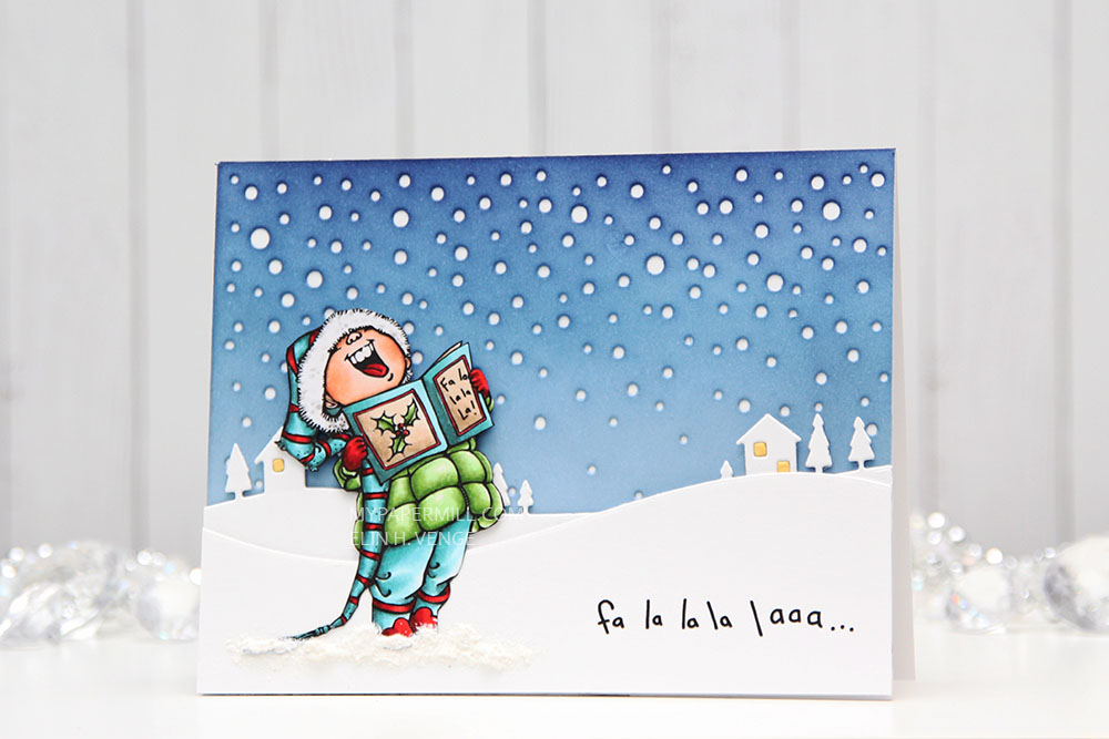I colored my image with Copics as usual. In a split complementary version this time. I’m not a fan of red (not even for Christmas), but when I can use it as an accent color along with blue greens and yellow greens, I feel it works better. I fussy cut my image right up to the black line and glued it to the front of my card.
