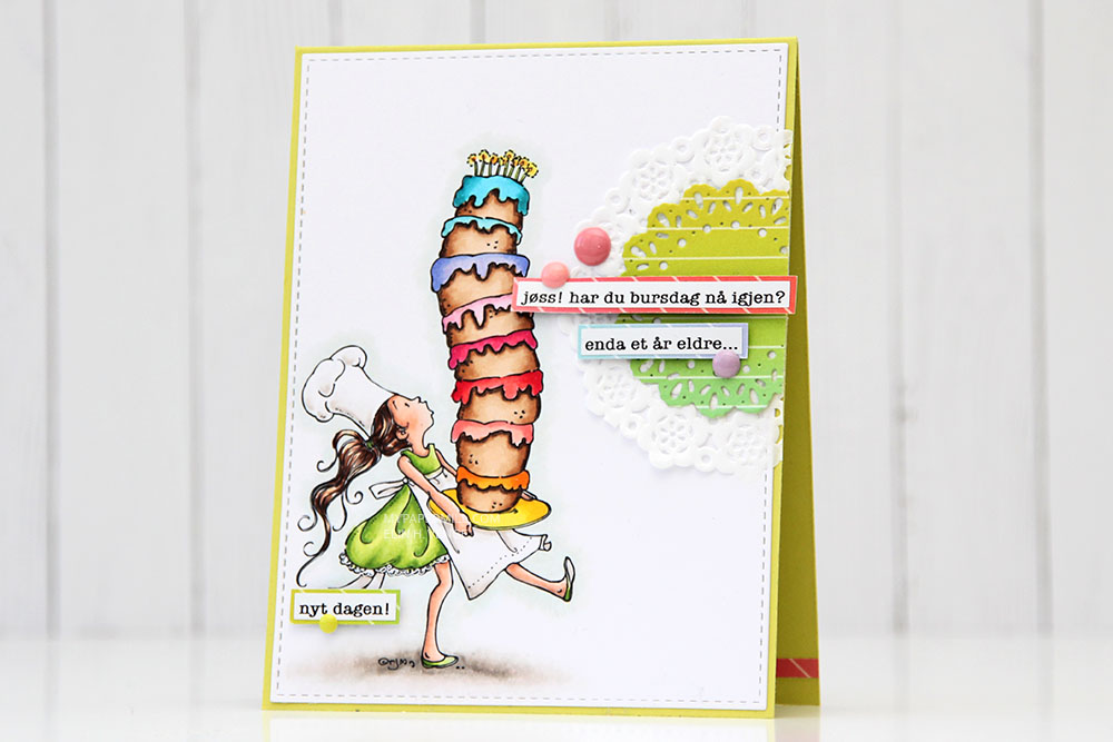 I changed up the sentiment a little. There’s an exclamation mark at the end, but I wanted that to be on the inside, so I added three dots instead and printed the same sentiment on the inside with the three dots in the beginning and the exclamation mark at the end.