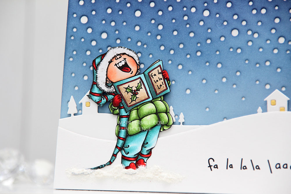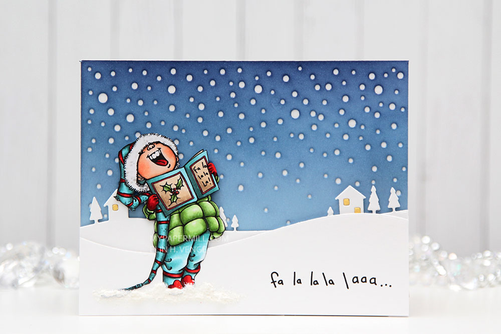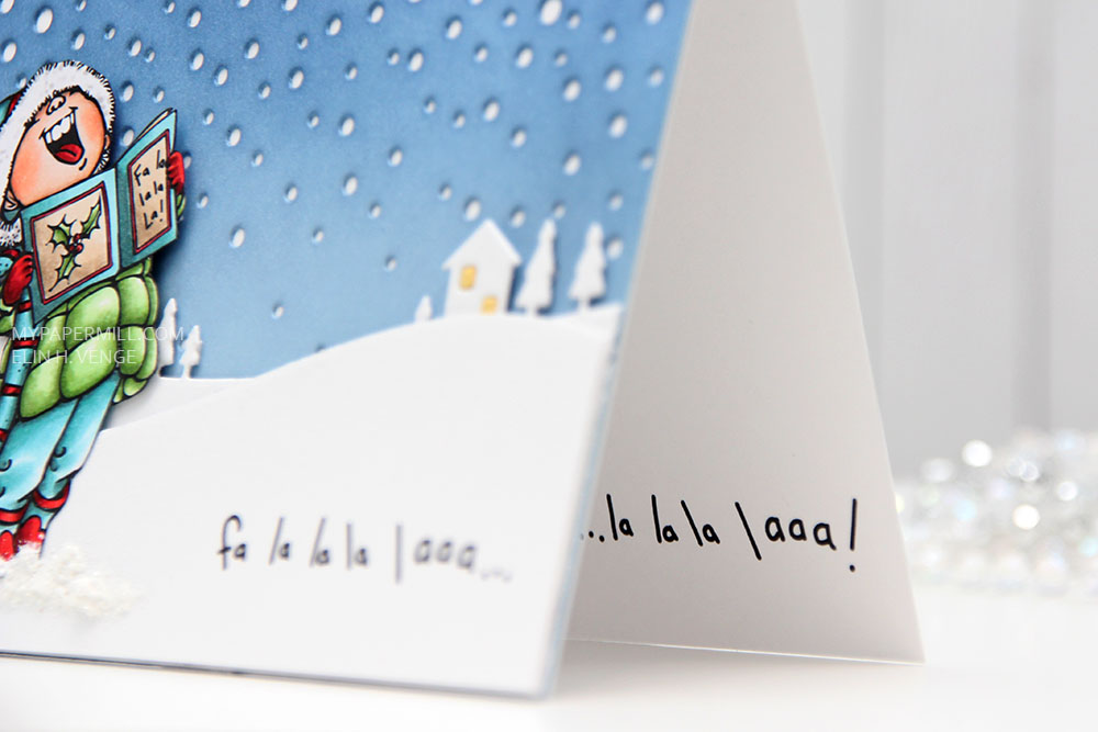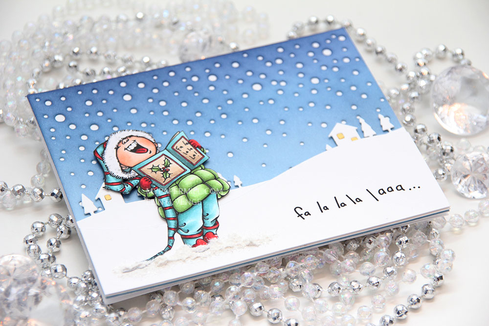 I colored my image with Copics as usual. In a split complementary version this time. I’m not a fan of red (not even for Christmas), but when I can use it as an accent color along with blue greens and yellow greens, I feel it works better. I fussy cut my image right up to the black line and glued it to the front of my card.