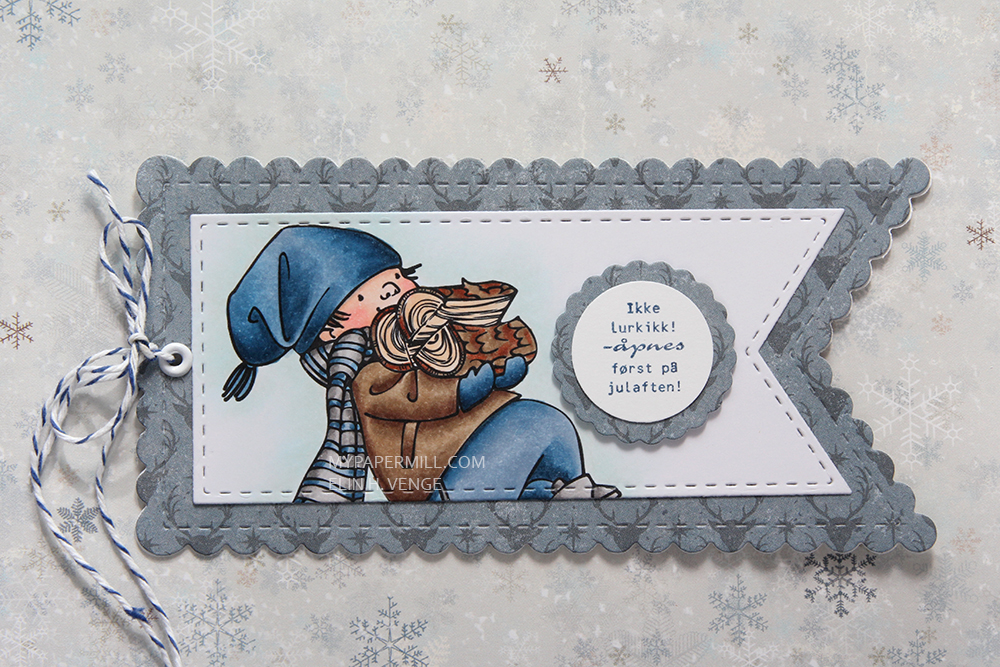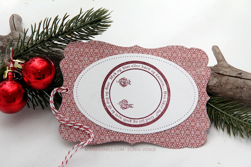 On the back of the tag I stamped a To/From stamp from Norsk Stempelblad AS using Smokey Shadow ink from Papertrey Ink, which is a nice dark gray. I attached a couple of loops I made from one of the patterned papers and was able to thread a candy cane through, I just hope the dog doesn’t get into the presents and eats the candy cane.