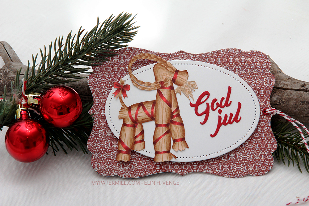 I stamped a sentiment from Norsk Stempelblad AS below the image using Scarlet Jewel ink from Papertrey Ink. Using a faux stitch tag die from My Favorite Things, I die cut four tags, one from the panel with the image and three from scraps of patterned paper from the Fröjdefull Jul collection from Maja Design. I glued two and two back to back, before gluing the two double tags together, offset quite a bit.