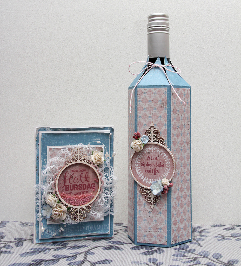 Jeg bestemte meg for at jeg skulle lage disse som et sett, så de matcher. Jeg har brukt mønsterark fra Vintage Summer Basics-serien til Maja Design på begge to, samme stempelpute og også en del av pynten er lik. I hver spiss på vinskjuleren har jeg satt en malje fra Making Memories for å forsterke hullene som tråden skal gjennom. På rammen har jeg limt 2mm perler fra Kort & Godt tett i tett rundt hele ringen for å pynte opp litt ekstra.