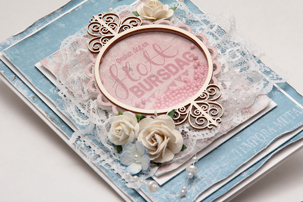 Jeg har laget hovedfokuset på kortet som en shakerboks, med glassperler inni. Disse perlene er kjempegamle, min bestemor kjøpte dem på bokhandelen på Åndalsnes en gang på åttitallet, men de matcher jo mønsterarket HELT perfekt.