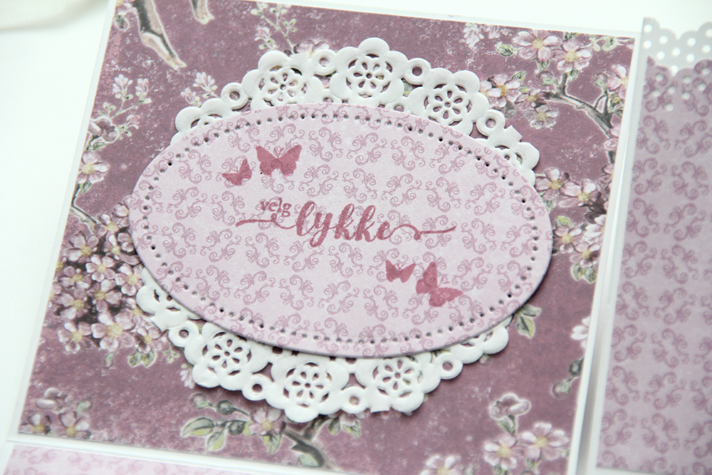 Kortet har jeg laget litt lag på lag. Jeg har brukt den samme rammen her som på vinskjuleren, og stemplet en tekst fra Norsk Stempelblad AS med Papertrey Ink Autumn Rose blekk rett på det ene mønsterarket. Jeg har pyntet enkelt med blomster og en perlestreng og lagt en tynn blonde bak som en slags ekstra ramme.