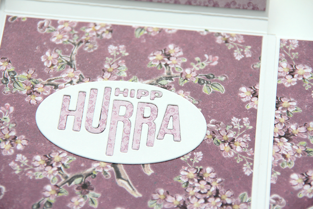 Når kortet er lukket ser det ganske lite ut, det måler i underkant av 4×4″. Jeg har pyntet veldig enkelt med blomster og erstattet midten av de rosa blomstene med perler. Teksten har jeg embosset i hvitt.