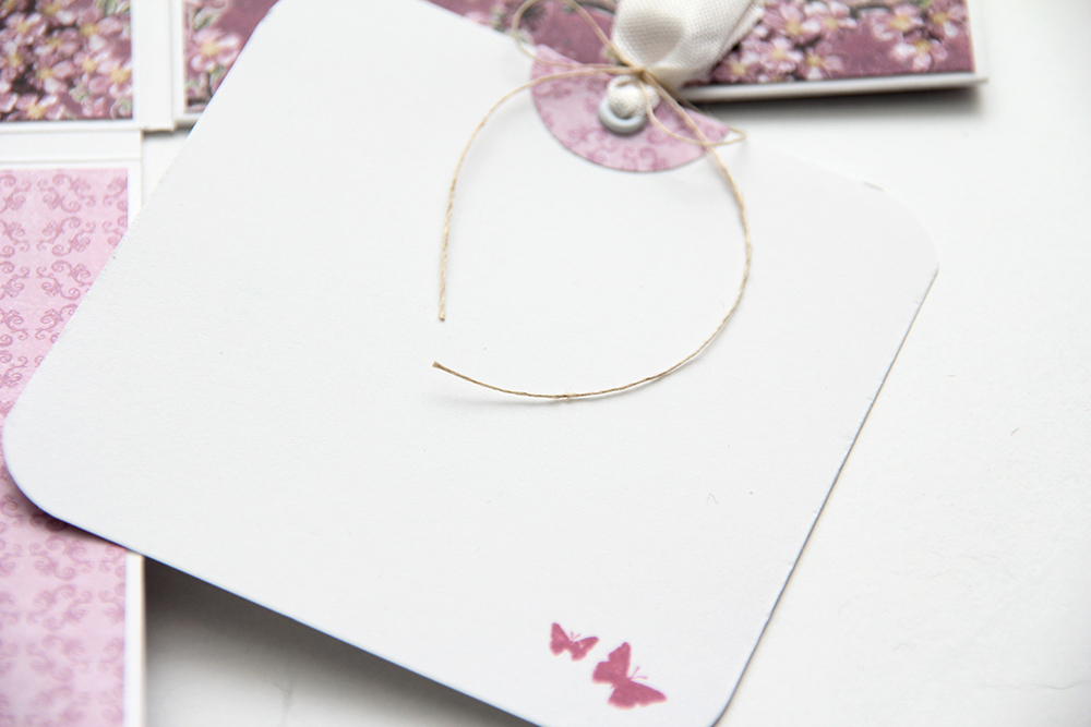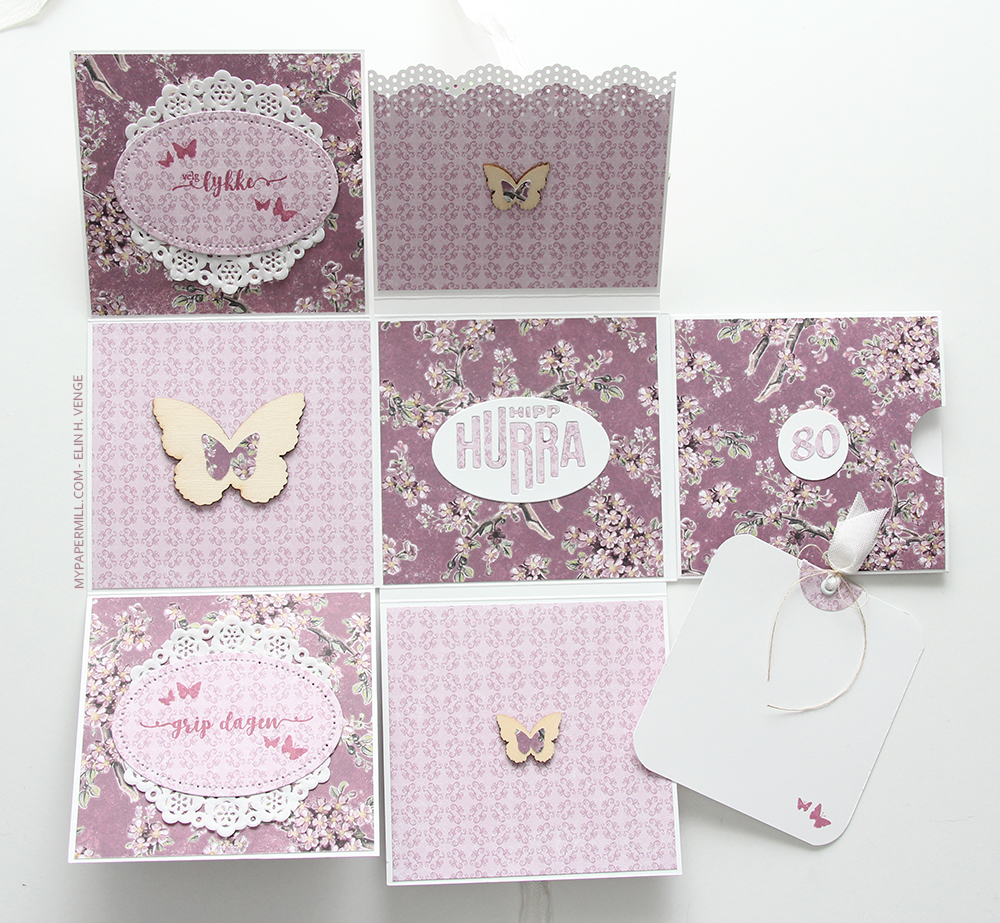 Høyresiden av kortet er en lomme med en tag med plass til en liten hilsen. Jeg har stemplet de samme sommerfuglene også her.
