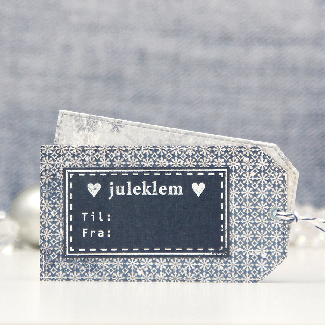 Jeg har brukt det samme oppsettet på baksiden av pakkelappen. Diecut og Til/Fra-stempel, stort enklere kan det ikke bli. Nå mangler bare å pakke inn gaven og henge på lappen.