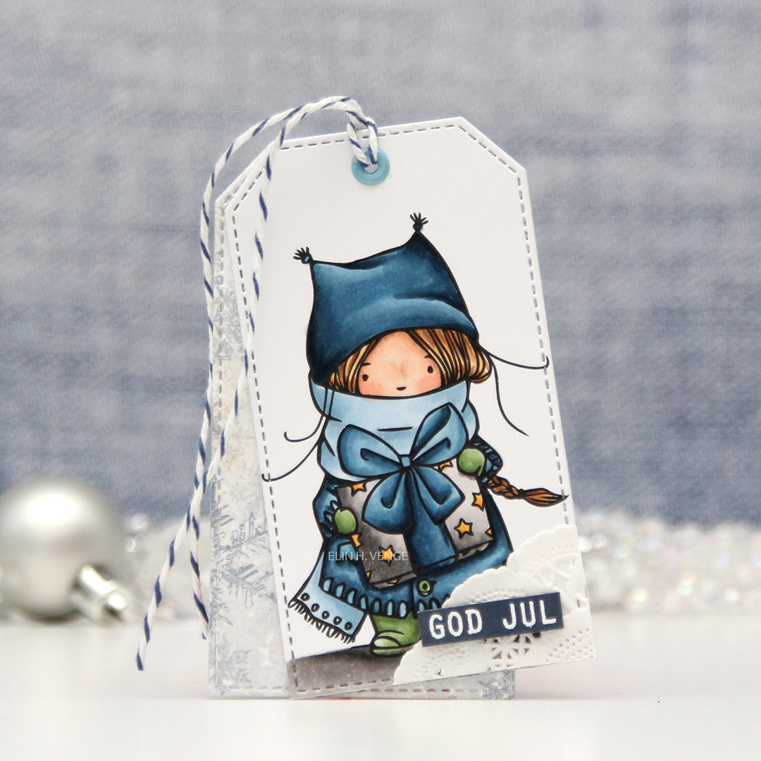 I colored the image with Copics, die cut it using a large faux stitch tag die from My Favorite Things and stamped a sentiment from Norsk Stempelblad AS on the bottom using Scarlet Jewel ink from Papertrey Ink. I created three more tag die cuts from the Fröjdefull Jul collection from Maja Design and glued one of them to the back of my colored panel. I glued the other two back to back and glued my two double tags together, slightly offset. I cut a hole at the top of the tag, used a red eyelet for strength and threaded some red twine through, adding a charm with mittens for that little bit extra.