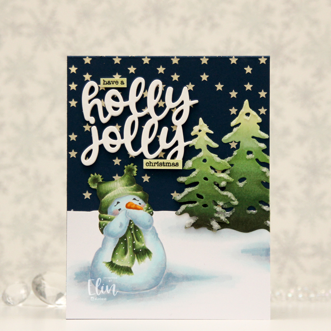 Once the stars were dry, I adhered my panel with my snowman, adding die cut trees a little bit below the horizon line. I created the trees by coloring a scrap piece of X-Press It using the same green markers I used for the image, before die cutting them using the Silhouette Snow Trees die set from Mama Elephant. I finished off the trees with some liquid glue and Rock Candy distress glitter for a sparkly, snowy look. For a sentiment I die cut the words holly jolly from the Jolly Holiday greeting die set from Concord & 9th five times from white cardstock and adhered them all together for a stacked, dimensional look and completed the greetings with some small words from the Holiday messages stamp set from Mama Elephant that I stamped in Obsidian ink from Altenew onto pieces of cardstock I colored with the lightest of the green markers I used for the snowman and the trees.