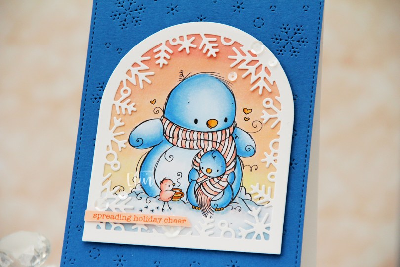 I printed the image onto X-Press It blending card and colored it with my Copics, creating a soft winter sunset behind the cute penguins. From white cardstock (Stamper’s Select White from Papertrey Ink), I die cut a frame using the Winter Wonderland window die from Lawn Fawn and adhered it to my colored piece.