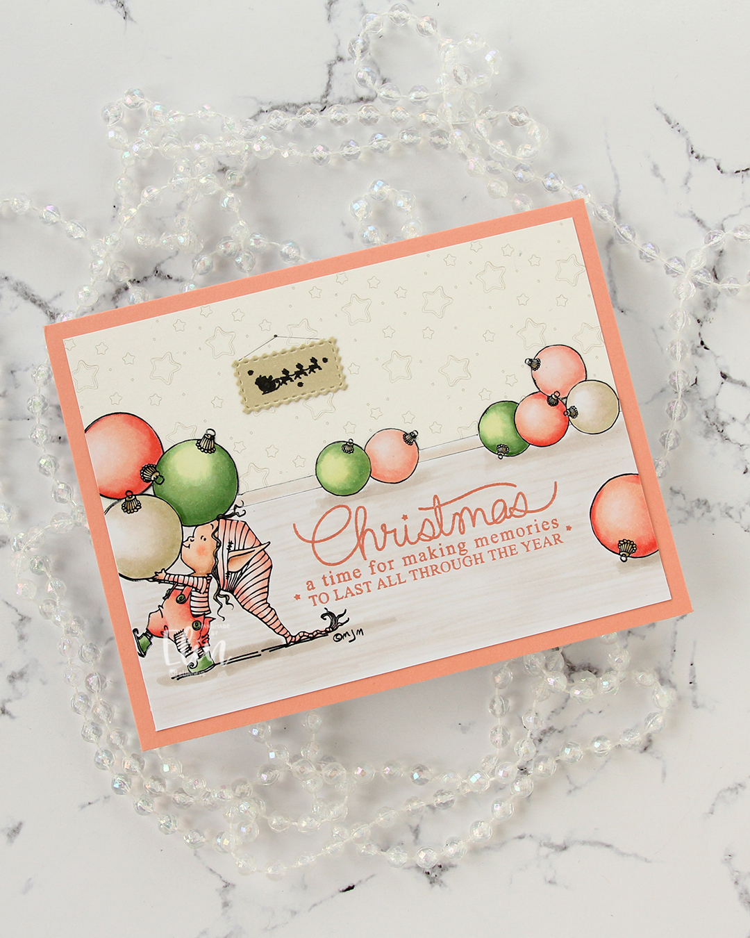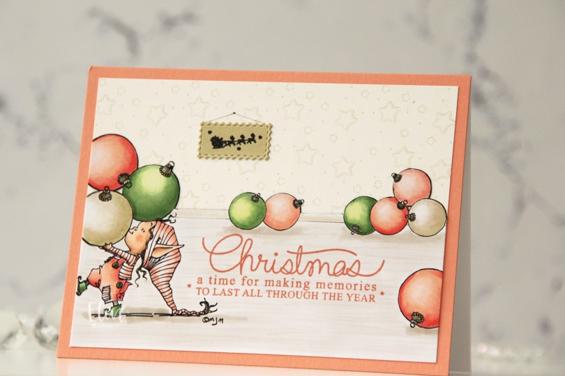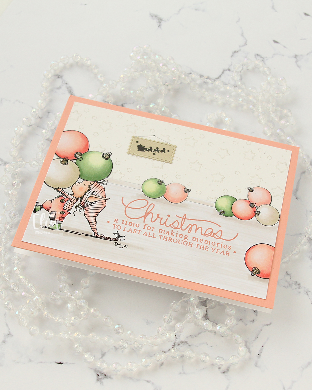 I separated out the baubles from the image and did some copy paste work to create my scene. It’s one of the advantages of using digital stamps, and it makes them super versatile. I drew in a base board at the back with a black Copic multiliner and colored my scene.