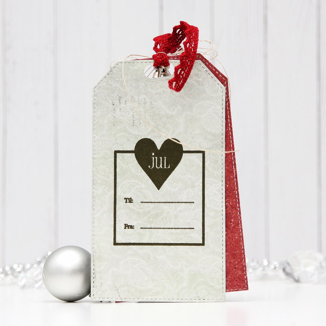 I die cut the tag an additional two times, once in a red patterned paper that I glued on the back of my colored piece, and once in a green patterned paper that I offset and glued on the back for a little interest. I stamped the standard To/From (this particular stamp is from Norsk Stempelblad AS) on the green patterned paper using Olive Twist ink from Papertrey Ink.
